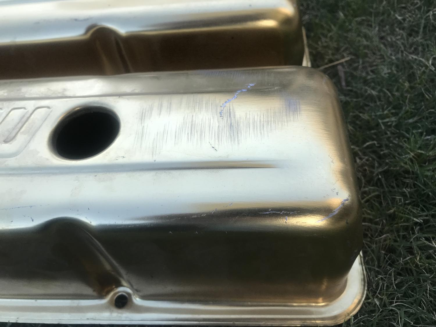 I say "sort of" as these had gaskets attached and were set on heads for mock up but never bolted down; customer went a different direction. They're the newer so-called closer lettered ones I believe, but they're still cool as all get out in a Day Two way. some wear marks from being shuffled around for years - they are great 5 footers and the insides, if that matters, are mint NOS - never had oil touch them. A larger area of scuffing on the top of one with some scratching from being lodged up in storage thinking their time would come. Also nicks and they are dusty - I didn't fluff these at all for the photos - WYSIWYG as they say. Gold anodized aluminum of course. Lots of photos to give the full picture. Getting hard to find, these. Cheers all, Anthony Last edited by AnthonyS; 02-05-2022 at 04:06 PM. Reason: update listing  |