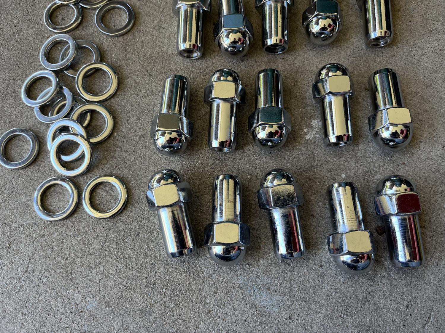 These are new, certainly NOS, and only a couple have been hand spun on to lug studs to check their size. Lots of photos below. Includes correct washers of course, all as shown.