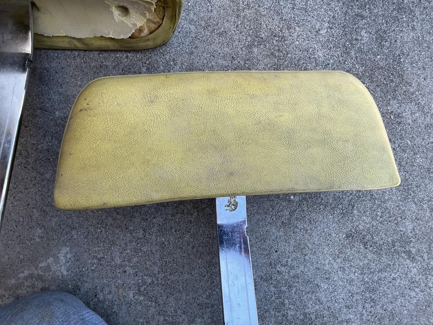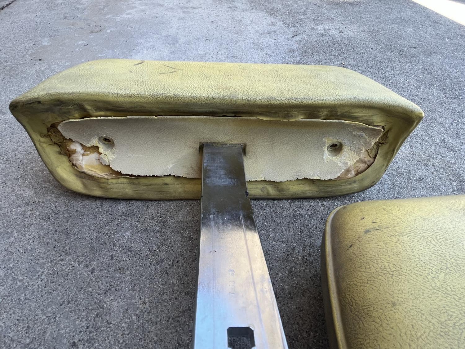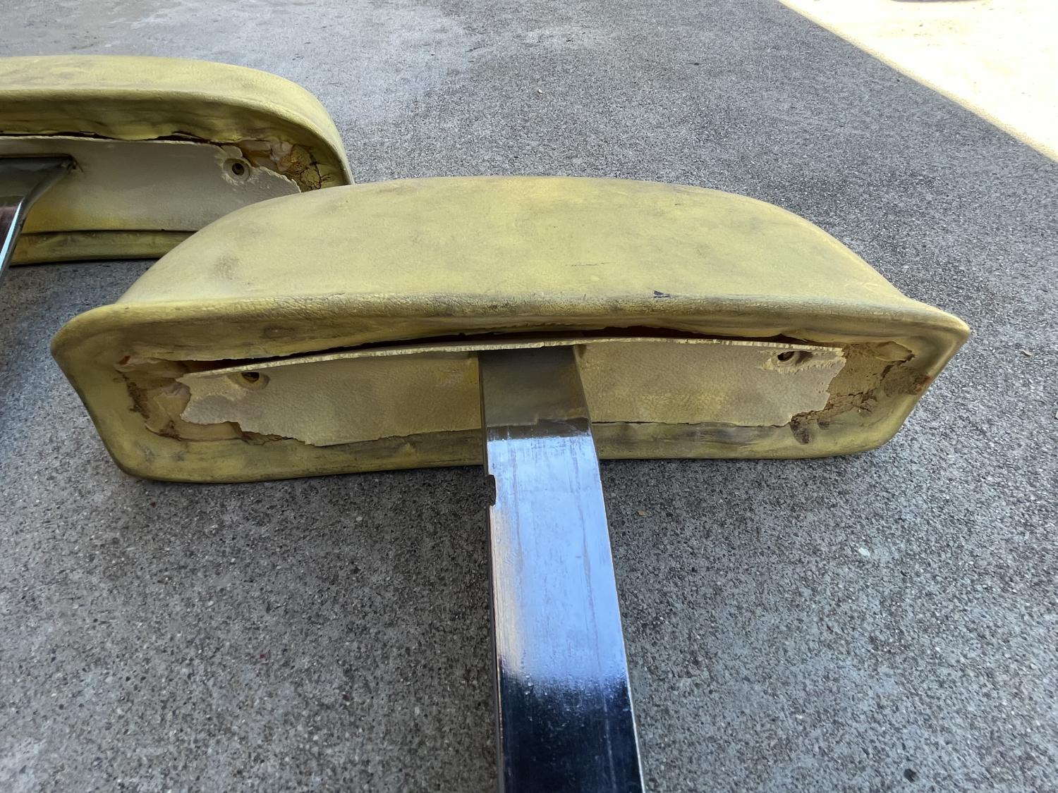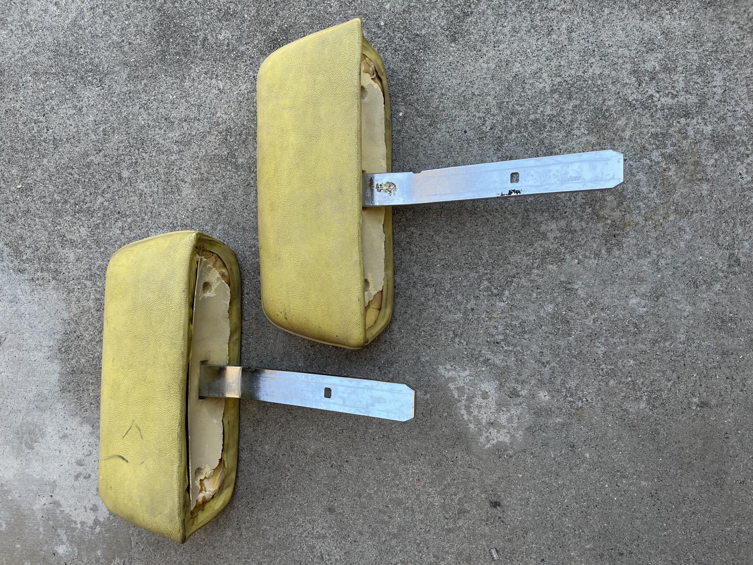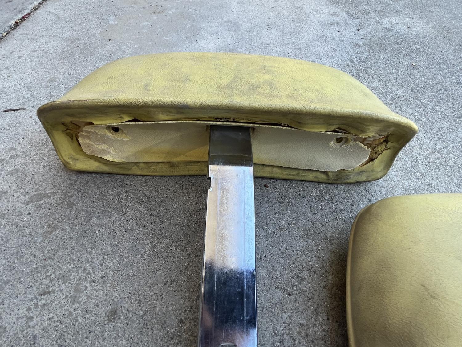 I have a pair of curved bar original yellow headrests for sale - they were off an old local barn find. Both bars are dated 7-30-69. The underside plastic is deteriorating and chalky. The passenger head rest was in the CA desert sun for decades and is brittle - I squeezed it and sure enough, I was the one who cracked it - see photos. They are genuine yellow pieces and could service for a survivor or driver car and will likely clean up a bit with some effort - just be careful on the one - the driver side is not a brittle / crunchy. See several detailed photos below for the whole picture. The last photo is me actively squeezing it to open the cracks; all pieces still there and holding on, no chunks missing. $300 PPG plus shipping. Cheers all, Anthony |
