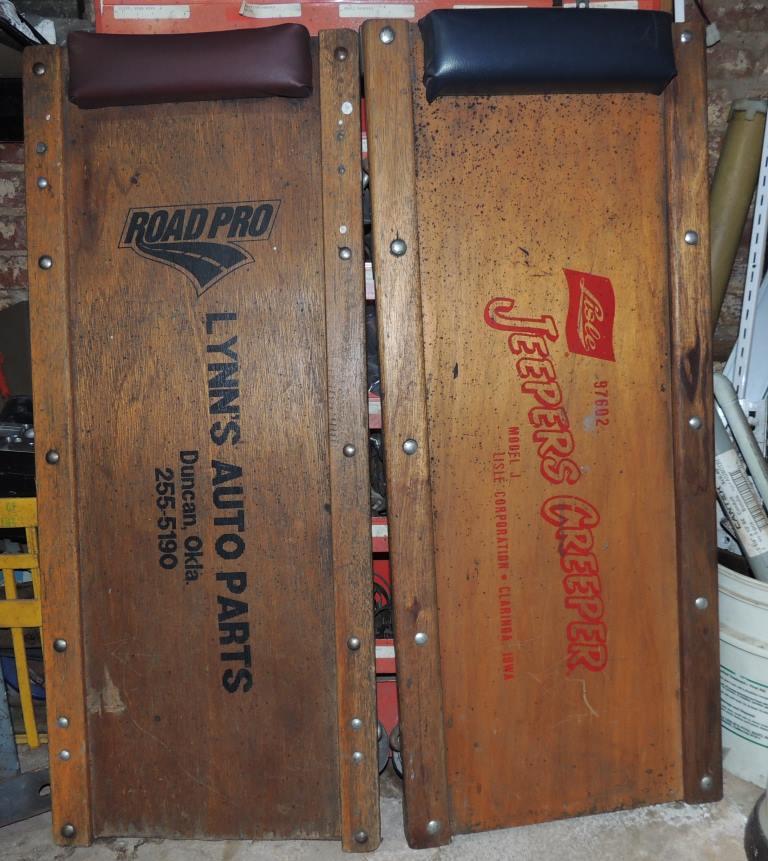 I accidentally lowered a car onto one corner and broke one of the original cast iron wheels. I found out that Lisle doesn't make these wheels any longer, but found one on Ebay. Figured for five bucks, even if all I got was some spare wheel assemblies, I was way ahead of the game. The "Lynn's Auto Parts" creeper is going on the wall.