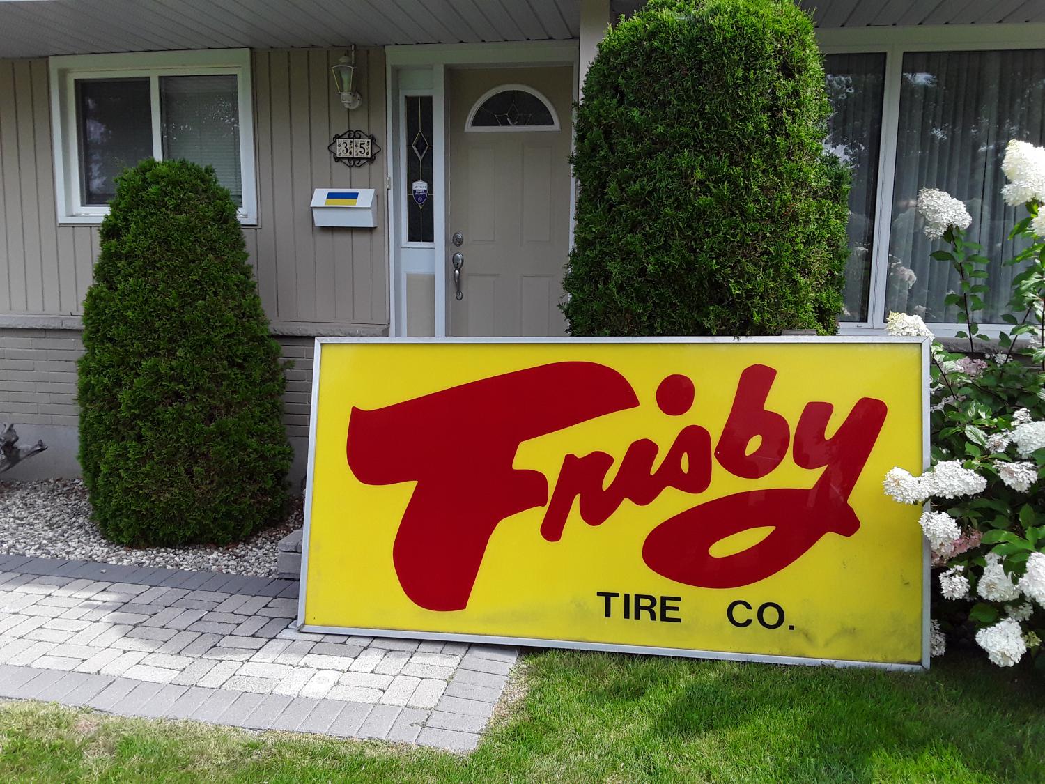 Frisby's is a local family owned tire business here in Ottawa that's been in business for 103 years! With 5 locations.They were also a Toshiba dealer. They were known as Frisby The Vulcanizer when they opened in 1920.I've been dealing there since around 1971 and have gotten to know Don and Dennis ,the owners.Back in the day have bought Goodyear Polyglass tires,American Racing wheels,8 track players,Toshiba home stereo and even a small apartment clothes washer for my girlfriend at the time.They have now sold out to Kal Tire and it's kinda sad to see them go.Few months ago I asked Don to give me one of their signs when they were taken down.Got it the other day.It's a fair size,8'x4'.Gonna put it in the garage or the man cave.Unfortunately nothing stays the same anymore.