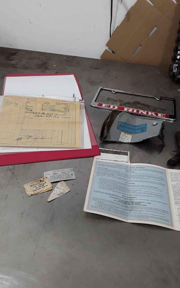"These are all original trim tag, Vin tag PROTECTO-PLATE dealer service warranty work and carpet tag. Also dealer plate frame on and one also title. This car was a 350 350hp silver, gun metal gray interior convert.