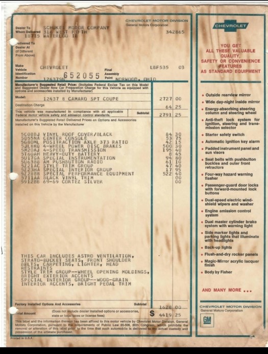 Many of you knew the late Warren Malkin and what a obsessed perfectionist he was when it came to Camaro stuff. He collected the rare stuff to the nth degree. Warren bought this Z28 in the 80's and parked it shortly after he bought it. I think he was the second owner. The first owner was James Patterson the director of SCCA. A few years ago as Warren was becoming Ill he and Chris White worked up a plan to get his Z28 up and drive-able before he was to ill to drive. Chris added the NOS crossram hood, rare GM single four barrel adapter that screwed to the hood and a equally rare NOS snorkleless air cleaner. GM prop rod, Gm hood pins etc. It's a mostly orig paint 25K mile car. Warren didn't get to drive it when Chris had it ready but he did come to MCACN with it. Chris told me about the car and said he was going to market it for Mark, Warren's brother. I couldn't stand it after being tortured by Chris with pics and info so I bought it. I'm very proud to own it and very sad Warren isn't around to enjoy it. This is a special Z that was owned by a special guy. Thanks Warren. R.I P.