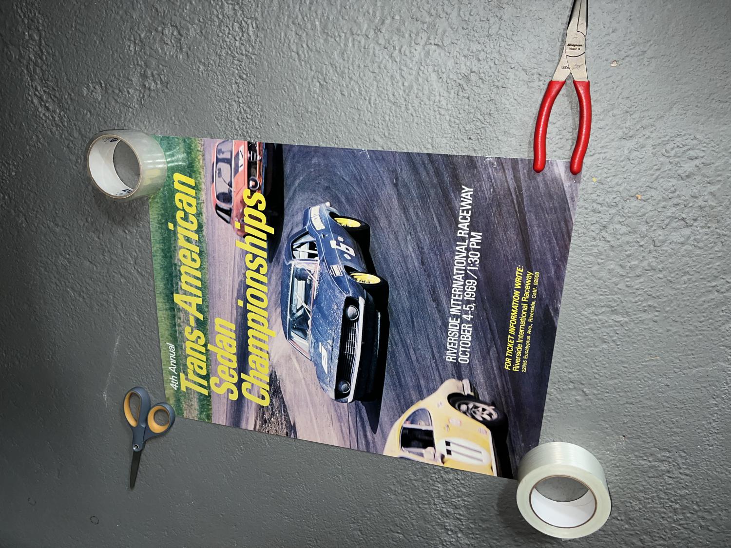It was a promotional poster for the Riverside International Raceway on October 4-5, 1969 at 1:30 PM. The banner reads “4th Annual Trans-America Sedan Championships.” 22x37 in size. Very hard to find. This is only the third poster I’ve ever seen in all my years collecting…and one resides in my collection! I can help with linen backing/restoration services if needed. $150 shipped OBO Regards, Dan [email protected]