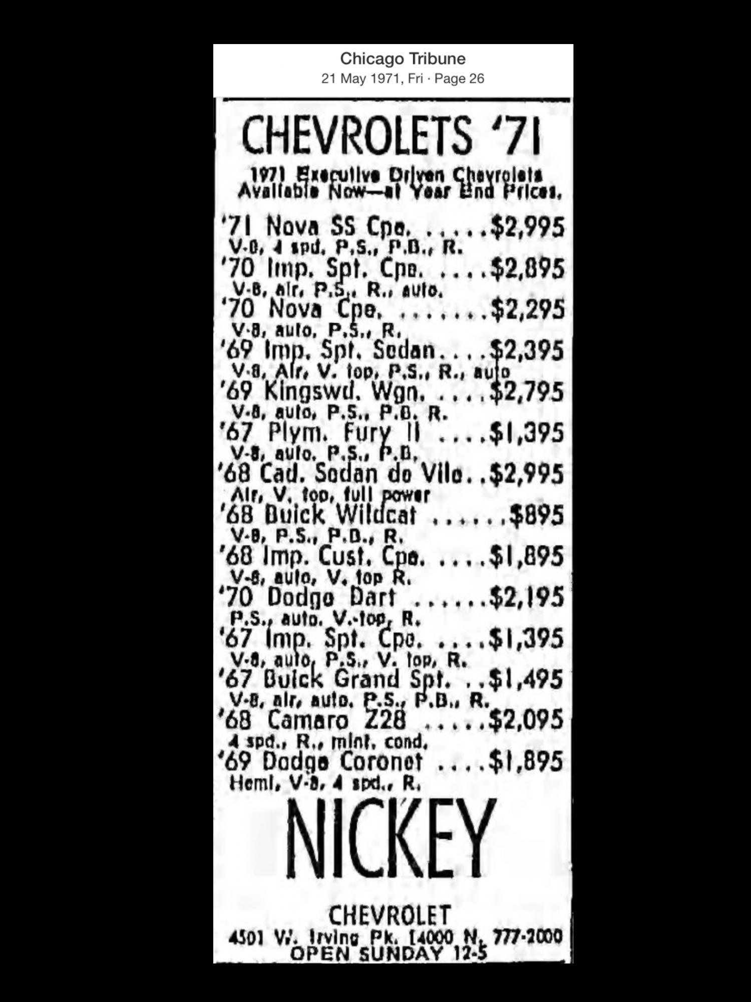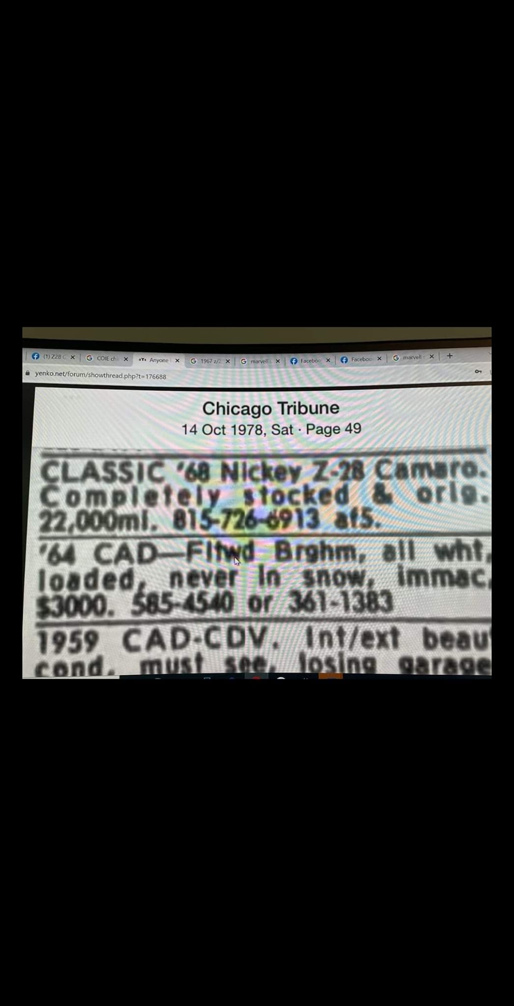 Not the Tradin’ Times or 1975 also no price but if any help, there was a 22,000 mile ‘68 advertised as a Nickey Z-28 in the Chicago Tribune 10/78 as below… ![]() ~ Pete .