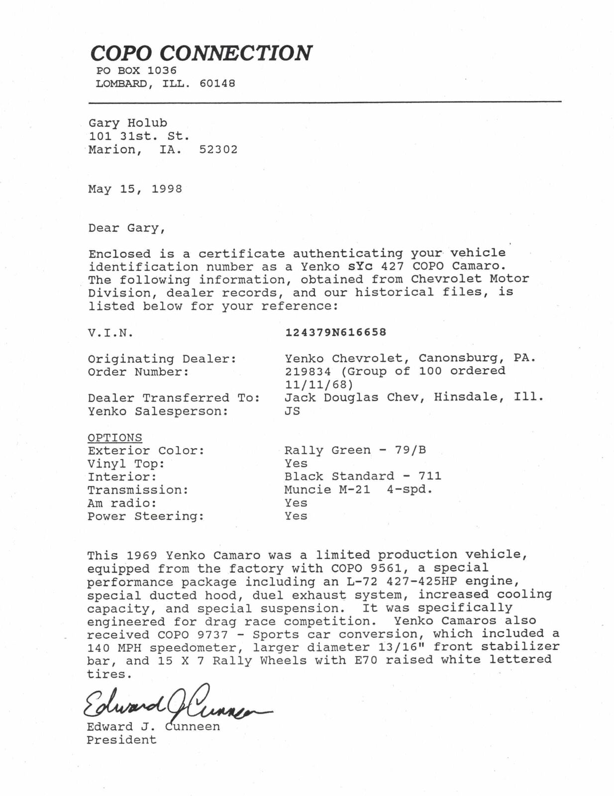 Jim The VIN on the dash, on top of the cowl, behind the heater box, under the rear passenger seat, driver-side dashboard bracket, etc. have all been confirmed & verified.