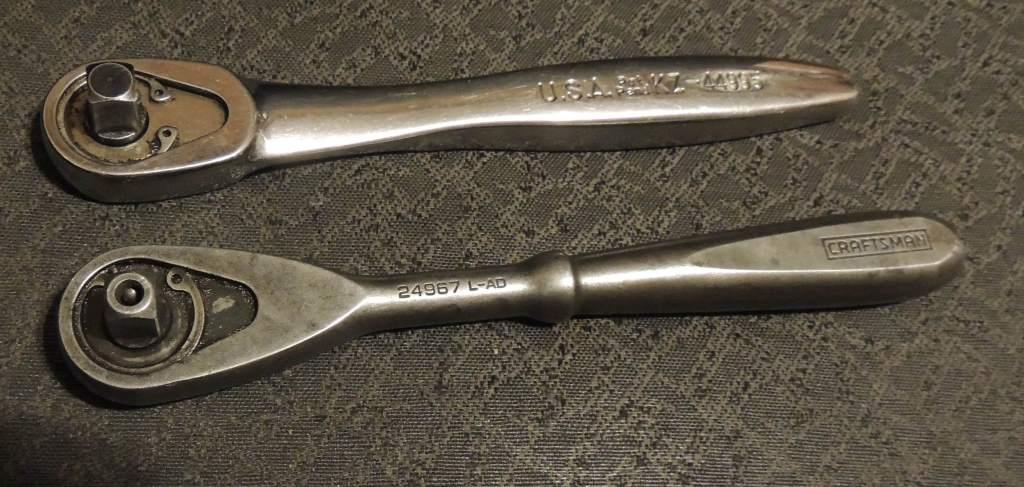 Got two REALLY nice SK swivel head ratchets, full set of Snap-on metric deep sockets 9-19, a set of Craftsman 3/8 drive thin wall deep sockets and a very nice 1/2" Dewalt impact wrench, barely used.... but i digress. The ratchet on top I have owned for quite some time. KZ-44995. I find myself reaching for this over the other 3/8 ratchets in my boxes. Very comfortable, and as you can see, the only thing that even shows wear is the selector lever. Not one chip or peel in the chrome. My questions are on the other one. 24967 L-AD. Although a bit tarnished, it does not have ANY pitting. I did a search and can't find much info. I found a couple for sale on ebay. They have the same number, but the letter code following the number is different. I suspect the letter code is a date code. Is that correct? Also, as you can see, the quick release button and mechanism is missing. Is there a repair kit available? If so, what part number am I looking for? I suspect the guts on these are interchangeable between the two bodies. Can anyone verify? Lastly, can anyone date either or both of these ratchets? I would guess the chrome one is 60 tooth and the other one is 40 tooth. Thanks for any help. Attachments