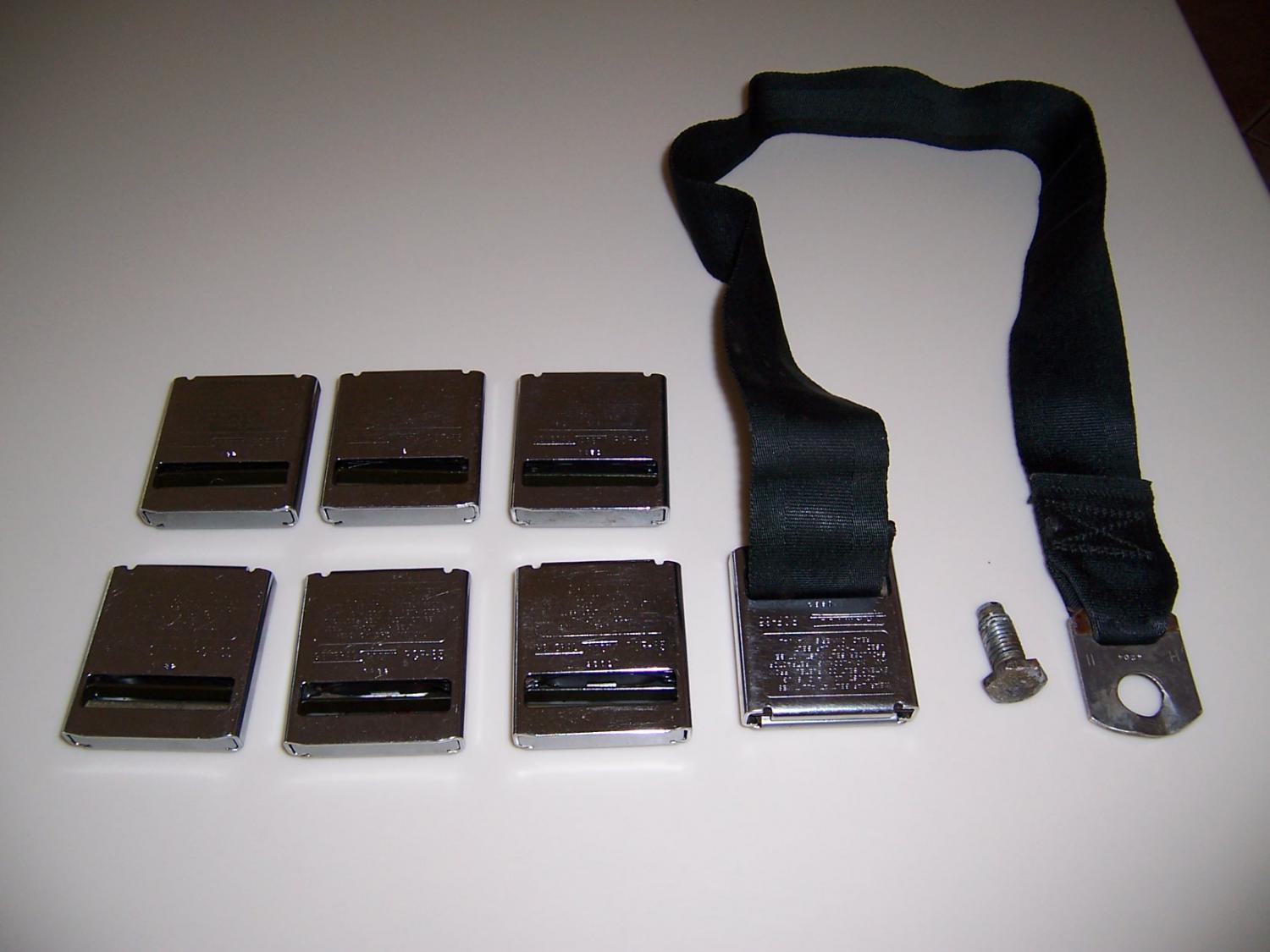 I currently have on eBay seven brushed metal Deluxe female end seat belt buckles for General Motors 1968 to 1972 models. In addition, one has a black belt still in place in the buckle, but it is missing the tag showing model number and manufacture date. That belt is 33.5 inches long, as shown. Everything you see in the pictures is included. One mounting bolt is also included. The belt material is very clean and pliable with no visible defects. The brushed metal female buckles are in excellent original condition. This would be a great opportunity for you to upgrade the standard equipment plastic buckles on your existing seat belts. Offered with a $9.99 minimum bid and NO RESERVE.