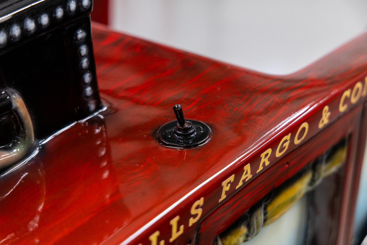 This piece has been restored to show quality standards and is in excellent working order. It retains its original All-Tech Industries Inc. manufacturers tag that reads Model #SC (Stage Coach) and Serial #123. The serial number indicates this was a very early built example. During the restoration process the original chrome railings and coin box were removed for a more realistic appearance. The original fiberglass horse body was stripped, prepped and repainted. The body was refinished in Buckskin coloring. The mane, legs, tail, halter and harness were refinished in black. The halter and harness trim was decorated with silver, blue and red coloring. The facial features are very realistic in appearance. The original fiberglass covered wagon known as The Wells Fargo Stage Coach was stripped, prepped and repainted. It was refinished in Cherry Wood coloring which gives a real wood appearance. The Strong Box was refinished in black with silver trim and the words Property of Wells Fargo in yellow. The painted blinds and windows are very realistic in appearance. The painted wagon poles and wheels are also very realistic in appearance. The horse body and Stage Coach was painted with an airbrush. Black painted metal step plates are attached to the front wheels which are used to get to the large seating surface. The original Formica base was stripped, prepped and repainted in black. The corners are decorated with stainless trim. The sides were decorated with Yellowstone decals which really gives the piece character. The base retains the original handle on the front for carrying and the wheels on the back for rolling. It was outfitted with a new 110-volt power cord. The 1/3 motor and mechanism is in excellent working order. During the restoration a new power switch was added to the top of the Stage Coach for easy access. When it's in the on position it runs continuously until its switched back to the off position.