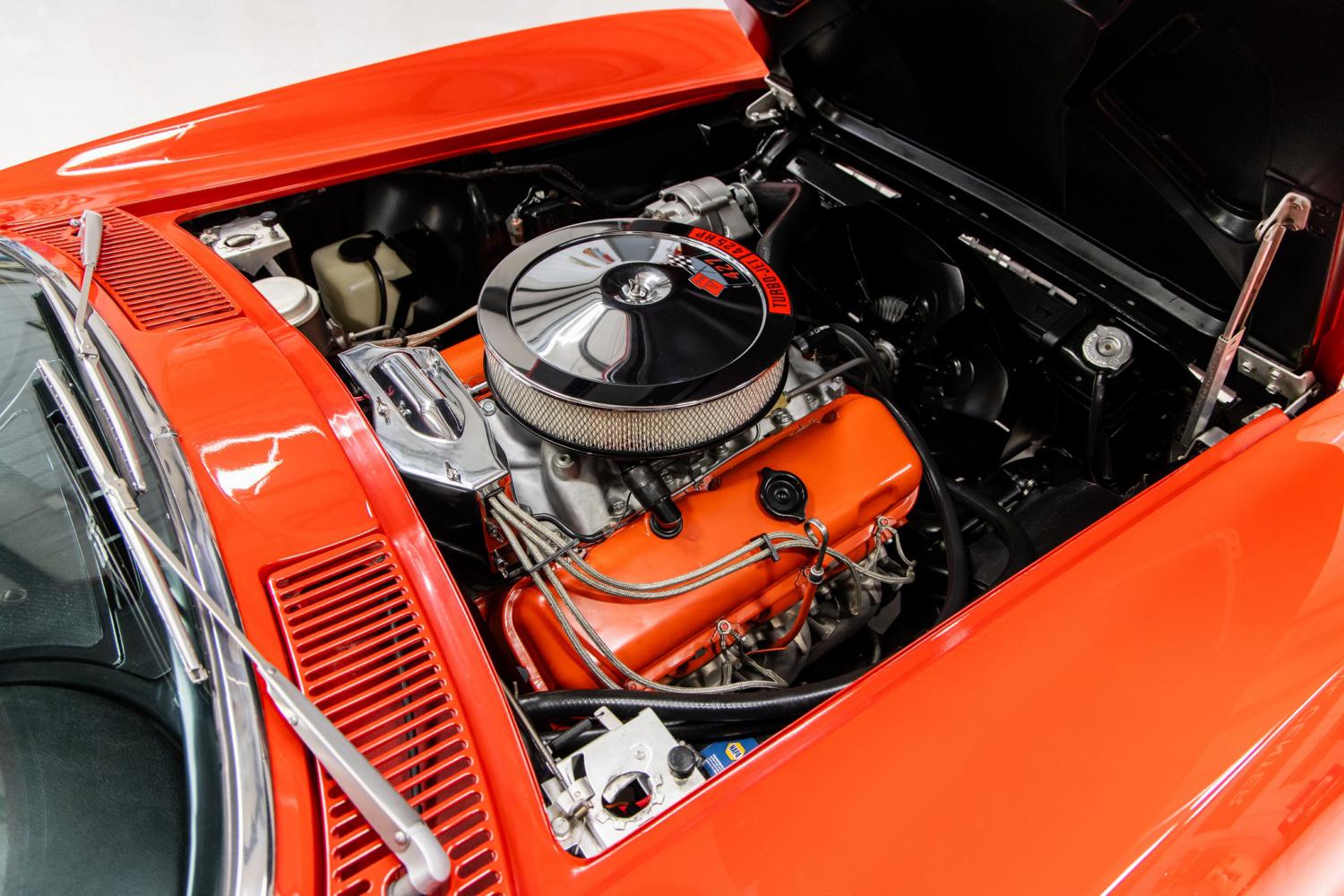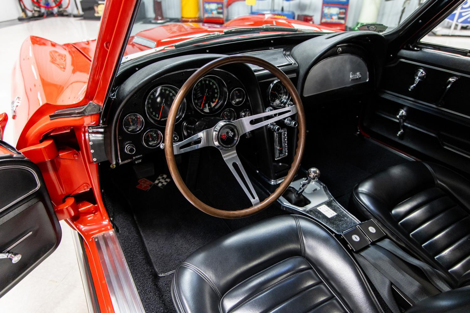 Dubbed, “The Ultimate C2” – this awesome 1966 Chevrolet Corvette 427 Coupe is loaded with desirable options and is in show quality condition throughout. It looks and performs excellent! This car is one of only 9,958 Corvette coupes produced in 1966. As the original Trim Tag indicates this car was originally built on September 24th, 1965 in St. Louis, Missouri with a Nassau Blue Metallic exterior along with a White and Blue interior. From the information gathered it was originally equipped with a 427/390hp V8 and 4-speed manual transmission. This car is the recipient of a nut and bolt restoration with great attention to detail. The painstaking restoration was undertaken over a period of many years by its former owner. The vision of the build was to create the ultimate C2 with the features that Corvette enthusiasts crave. The fiberglass body was stripped and prepped with laser straight lines. The special “big block” bubble hood and fender vents add to the factory sporty design. The body was refinished in desirable and correct Rally Red which was an available color choice in 1966. The high quality paint was recently detailed to a mirror finish. Everything on the exterior was restored or replaced new such as all the glass, stainless trim, wiper arms, driver's side mirror, hood vents, front grill, spilt bumpers, parking lights, rocker moldings, tail lights and emblems. The car rolls on desirable 15” Kelsey Hayes knock-off wheels that are wrapped with Cooker Classic Redline tires. The exterior is complimented with a desirable and correct new black interior which was an available color choice in 1966. The color combination a Red exterior and Black interior is striking. Everything in the interior was restored or replaced new such as the headliner, dome light, rear view mirror, dash pad and fascia, gauges, analog clock, temperature controls, AM/FM radio with power antenna, 3-spoke wood trimmed steering wheel, aluminum trimmed glove box fascia and center console, original shifter, door panels, bucket seats, seat belts and carpeting. The spacious rear cargo area was also covered with new carpeting. The engine compartment is highly detailed throughout. The backside of the hood, firewall, inner fenders and radiator support panel was refinished in the correct satin black color. The car is powered by a correct 427 V8 with 425hp upgrades including the camshaft, rectangular port heads and aluminum intake. The engine was completely rebuilt and runs excellent. The engine was outfitted with the correct orange valve covers, Holley carburetor and chrome air cleaner with 427/425hp decal. Everything in the engine compartment was restored or replaced new such as the wiring, ignition system, alternator, hoses, radiator, fan, exhaust manifolds and battery. The engine breathes through the desirable and correct side mounted exhaust system which sound so sweet. The engine is coupled to a Muncie 4-speed manual transmission that was rebuilt and shifts smoothly. The undercarriage is highly detailed throughout. Everything underneath was restored or replaced new which should be displayed with mirrors at a car show. It's equipped with power steering and 4-sheel disc brakes with correct 4-piston calipers. The rear suspension was upgraded with C3 components for a better ride. This car was recently completely serviced and detailed which is documented with an invoice that's included. From the MS CLASSIC CARS Collection.