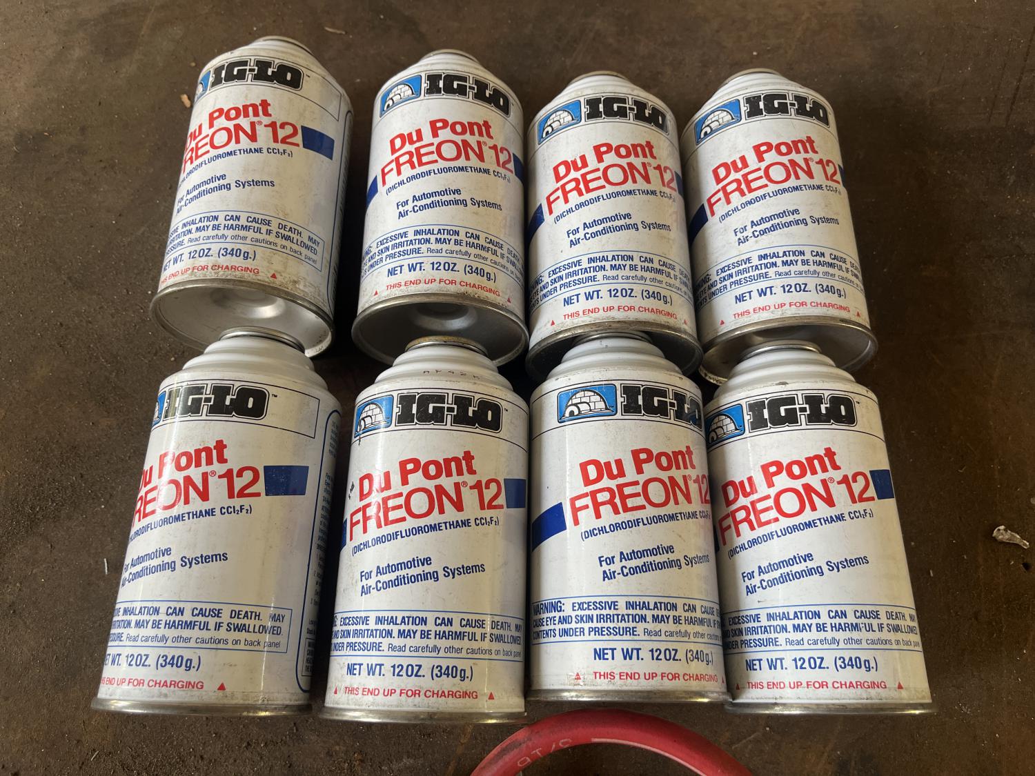 I have some vintage NOS R12 freon cans available - which must be shipped ground. This is a group of eight (X8) 12oz cans - DuPont IG-LO brand Total of 96oz which is 6 pounds and very likely plenty enough to do one complete system with some left over maybe . Not getting any easier to find this stuff. And it works well, as we all know. And please remember, by law, only trained & licensed professionals should deal with working on, evacuating, and or filling R12 systems - for the sake of the planet, and to help offset our likely significant impact otherwise... Includes ground shipping to the 48 and the shown Goodyear hose. Cheers all, Anthony |