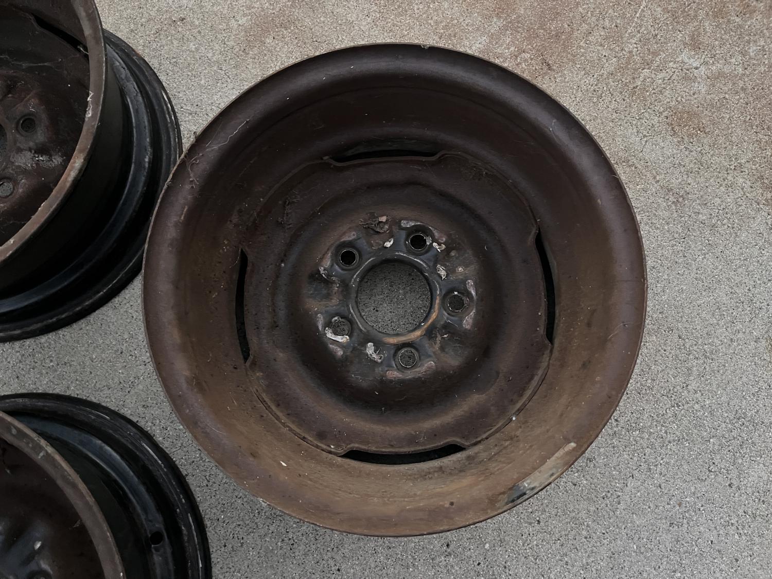 Just rescued from yet another resto mod of a 1969 convertible. They spin straight and have only a minor rim nick or two as shown. One sat for the longest time face up and rusted a bit in the spider web as also shown. Lug holes good and not wallowed out. I believe these are SS / SS396 plain wheels - they will certainly clear disc calipers - both four and single piston versions of 1968 and 1969. Will fit many other GM cars of the era as well of course. Only three available as shown - the fourth wheel was / is a rally - a YW ralley I believe... that one will be for sale tomorrow and I'll post an ad for it... Priced individually at the beginning of the ad. Not getting any easier to find, these... No dates by the valve stem - just faint "XE" stampings as shown. Clearer in person; takes some imagination through these photos; sorry about that. The inside hoops and beads of the wheels are very nice - I just removed the ancient tires yesterday; two bumps by the valve stem hole as well, of course. These are absolutely as found, and I suspect, original black paint - but, of course, I cannot be totally sure on that - just using context clues. Take a look at the photos again, these are hard to find rims anymore, IMHO. Cheers Friends, Anthony |