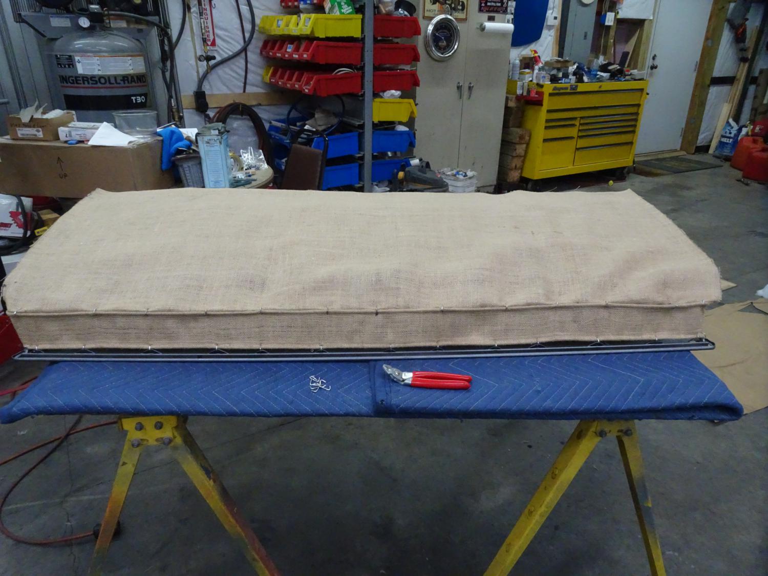 I think I have seen this layer of jute type material on the bottom of full size car seats. Is it just an added barrier for heat/cool ? I probably won't replicate this. ![]() ![]() ![]() Once I removed the cover and added foam padding, I found a jute like pad under where the cotton batting would have been. It is definitely original and was hog ringed to the spring. ![]() Piece of jute added to replace missing original. ![]() ![]() The jute is quite thick and has a burlap type backing attached. ![]() Another layer of burlap at the bottom, with the spring steel wires. Anyone know of a source for this burlap with wires ?? ![]() Tag on the burlap. ![]() Bare, rusty frame. I took both pieces for sand blasting yesterday.