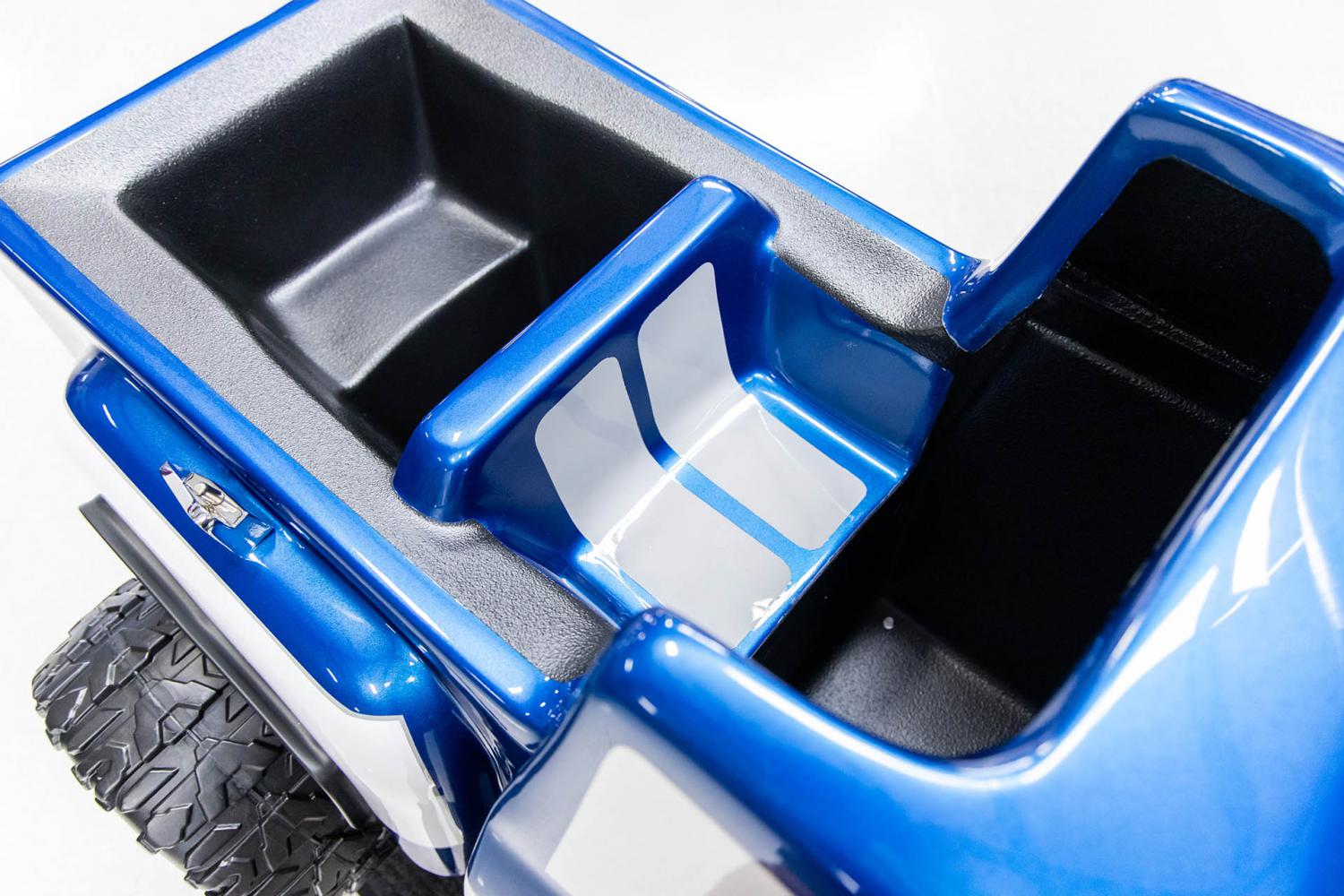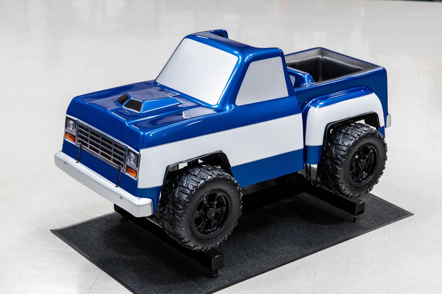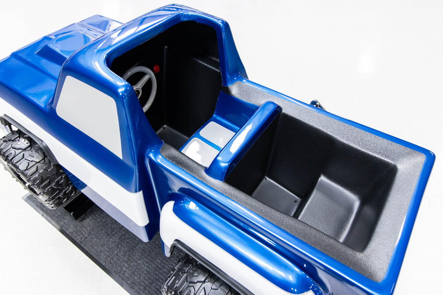 This 44-year old coin-operated children's ride is the ultimate collector's piece of memorabilia from the 1980's. A time when rock and roll band members had crazy long hair and the front of pickup trucks were square. The original fiberglass F-100 Step Side Pickup body was stripped and prepped to be straighter then the original factory model was. The body incorporates a hood scoop, front and rear bumpers. The original coin-box unit was removed and a chrome coin mechanism was discretely fitted into the body. This custom feature allows the ride to be more realistic appearing. It was painted with automotive grade-paint in the beautiful colors of blue and white with silver trim. A custom made front grill with headlights graphic was applied to the front and a custom made Ford graphic was applied on the tailgate of which both were clear-coated over. The windows, white body-side stripe pin striping and bumpers were painted in silver to for a realistic appearance. The paint work is high show quality throughout and was recently detailed to a brilliant shine. The rubber fender trim and operational rear taillights were also added for a realistic appearance. The pickup was outfitted with custom black wheels that are wrapped with Power Wheels Ultimate Terrain Traction tires. The interior is also made of fiberglass which was stripped and prepped to be straight. The cabin was finished in a durable black paint. The front seat was painted blue with white stripes to match the exterior. The steering wheel was painted silver and is next to the operational red horn button.