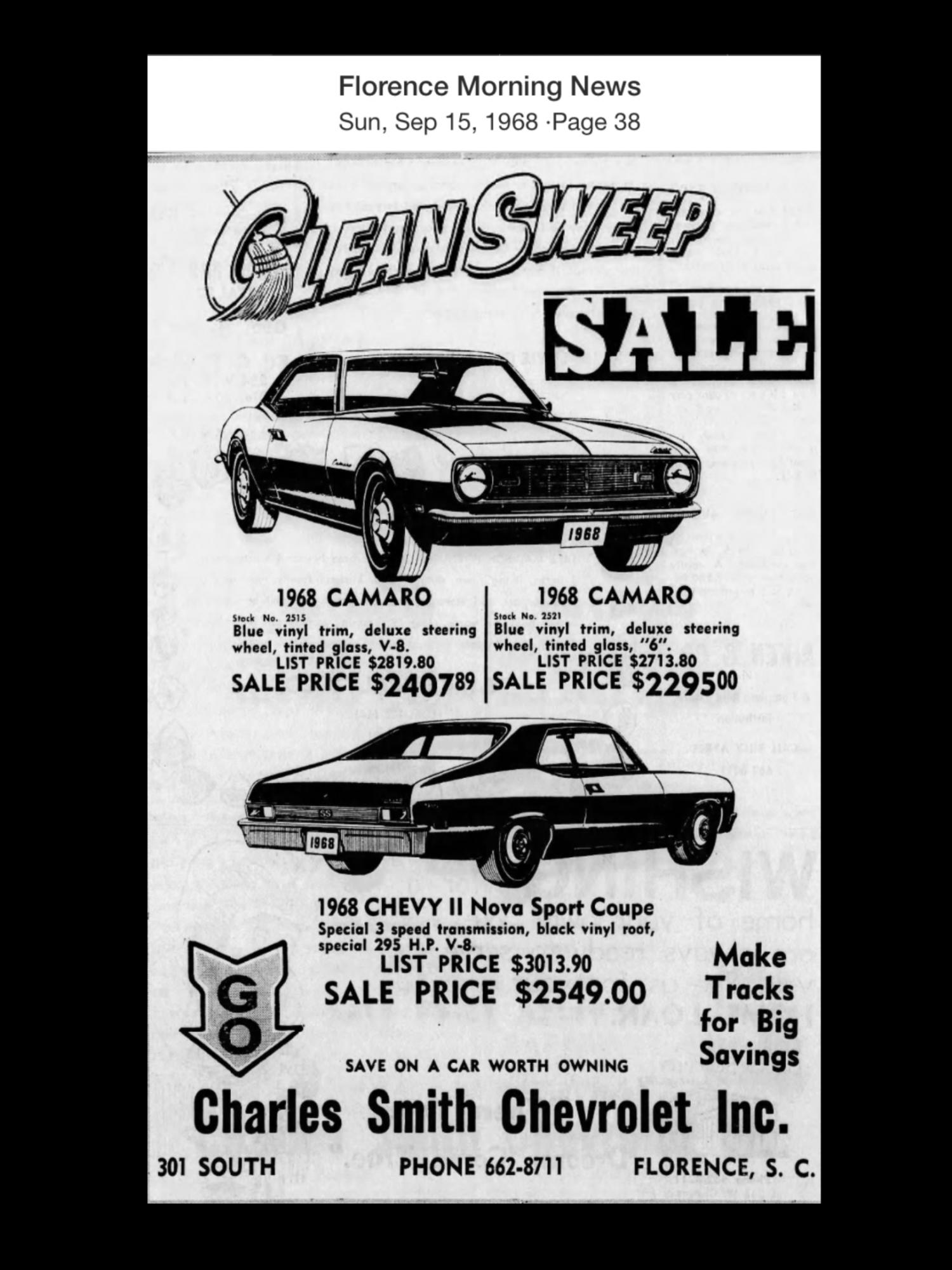 Per the POP (that I have), this heavy optioned car was purchased new on 11/14/67 from Charles Smith Chevrolet, in Florence SC. I purchased it from the OP in 1986.