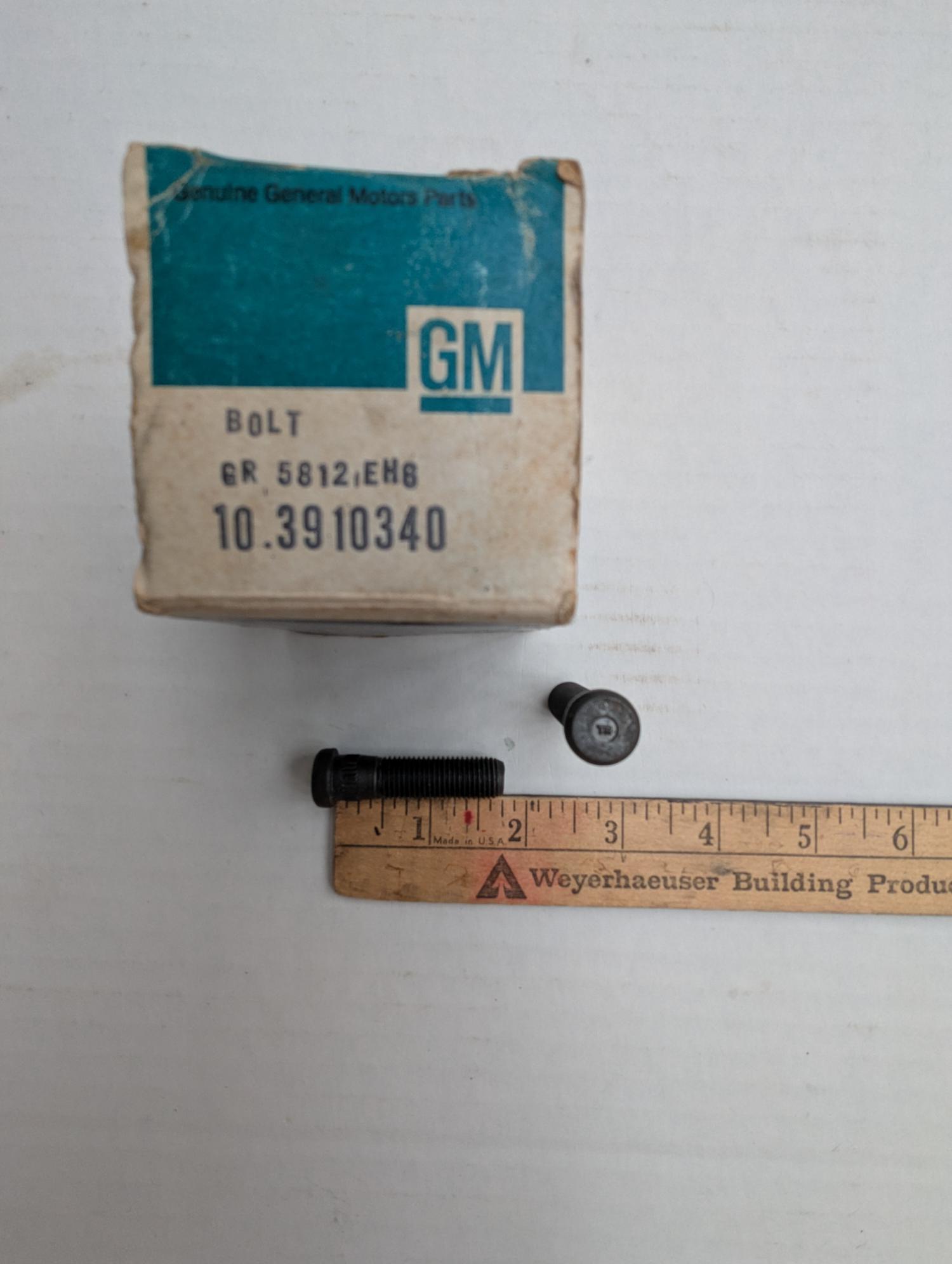 I have a box of ten NOS GM #3910340 wheel studs. I have the application for 1965-1982 Corvette, but I am not sure if they were used for other GM vehicles. They have the "TR" head mark on the stud head. $8 each or quantity discount at $5 each plus shipping.