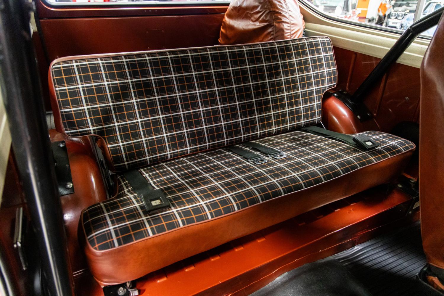 The interior of this Scout complements the exterior perfectly with its original Russet upholstery. The original light tan perforated headliner and sun visors are in excellent condition. It's been outfitted with a cowboy hat holder which was added by the original owner. It's equipped with a black roll bar that was installed by The International Harvester dealer when it was new. The black dash pad was recovered in leather by the original owner. The original tilt steering column, 3-spoke steering wheel, black dash fascia, speedometer, heater and air conditioning controls are in excellent condition. The alternator, temperature, fuel and oil pressure gauges were replaced with NOS. The original bucket seats and rear folding seat still retains the original upholstery along with the original seat belts. The top of the door panels and console with shifters is painted body color. The original orange rubber flooring was replaced with NOS black rubber flooring. Some of the custom features include a chrome fire extinguisher, Autometer tachometer, JVC stereo, center console with wood top, cup holders and storage compartment. The spacious rear compartment houses a full size spare tire with cover. Everything in the interior is in working order including the lights, gauges, stereo, heat and air conditioning system.