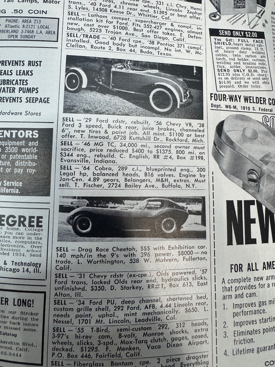 Fire up the Time Machine. We’re going back to the November 1965 Hot Rod Magazine Hot Rod Mart near the end of the magazine. I wonder if L. Worthington of Fullerton CA got the 8,000 dollars he was asking for his 396 Cheetah. Just above that ad is one for a 64 289 Cobra being sold by a man in Buffalo NY. The classifieds are some of my favorite parts of these magazines.