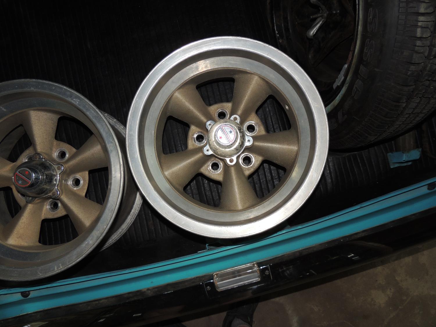 I picked up a pair of torque thrust wheels locally that a guy has had in his attic for the last 40 years. Identical size, width and offset as the ones on the car. Really nice condition. Did American Racing ever paint the centers gold? I am thinking not. Will likely clean all four wheels up and paint them all gray. I need to install the new master cyl and replace the rear wheel cylinders, so will wait until I have all the parts to do the wheels. I included a photo of one of the wheels that came on the car to show the color. I am thinking that is the color I want for the centers.