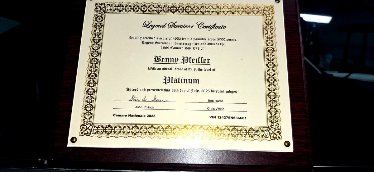 For unrestored cars we certified the following: 1969 SS L78 with 12k miles, owner Benny Pfeiffer Legend Survivor Certified, awarded Platinum overall 97.8 score 1967 RS Convertible 69k miles, owner Elizabeth Nash Vintage Certified, awarded Heritage. 5 of 6 areas scored 85% or better. Orig owner Lee passed in May and daughter now owner. This is a tech center modified car with amazing history. 1969 RS/Z28 with 45k miles, owner Bill Ward Vintage Certified Reference. 3of 6 areas scored 85% or better. Vintage & Legend Certification judges for this show: Steve Shauger Chris White Bob Harris John Pollock