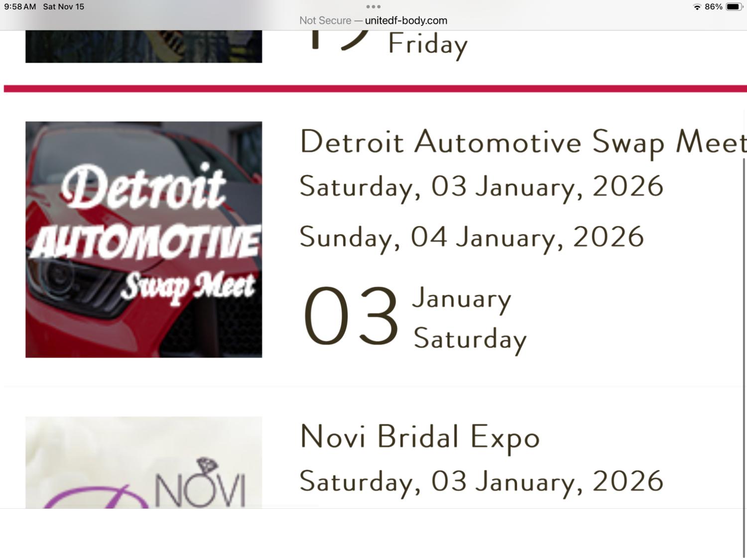 Detroit Swap Meet Saturday 1/3/2026 @ 8:00 am - 5:00 pm Sunday 1/4 8-1pm $10/day parking For more information, call (770) 330-8559 Venue: Suburban Collection Showplace of Novi 46100 Grand River Ave, Novi, MI