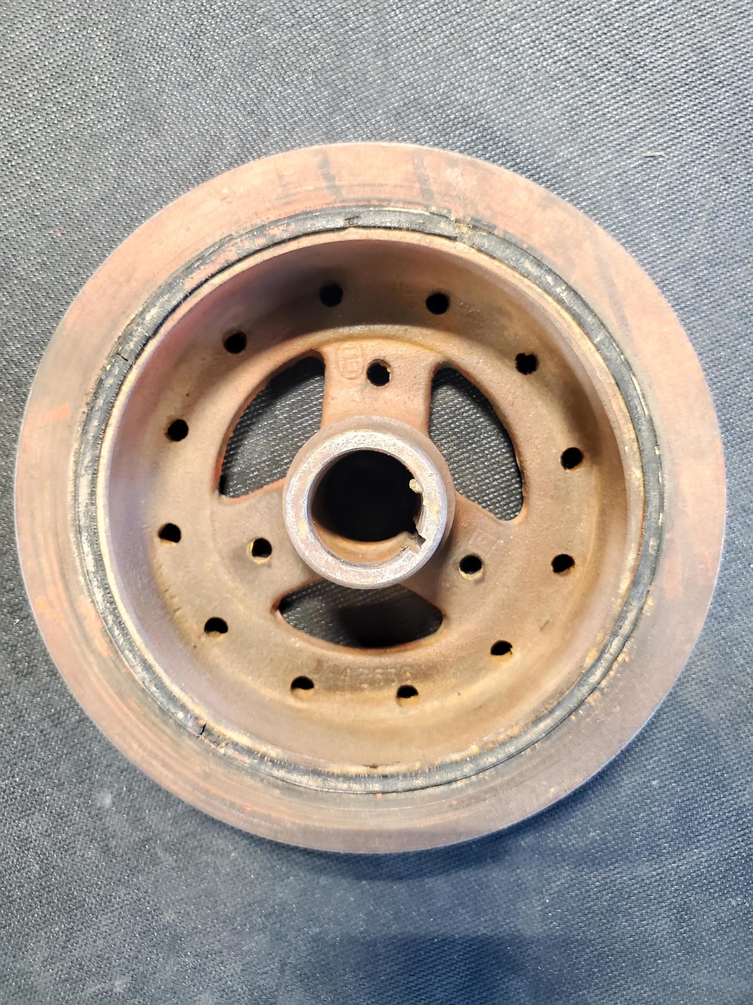 I believe this to be a 1978 350 balancer but can’t see any reference in the photo’s. 1968 and 69 balancers differ in the placement of the timing mark. 68’s are centered ( roughly) on the leg and 69 is just left of the leg that Has the keyway. Also jl8z28 is correct in that the “Windmill” should extend out to the rubber. Joe |