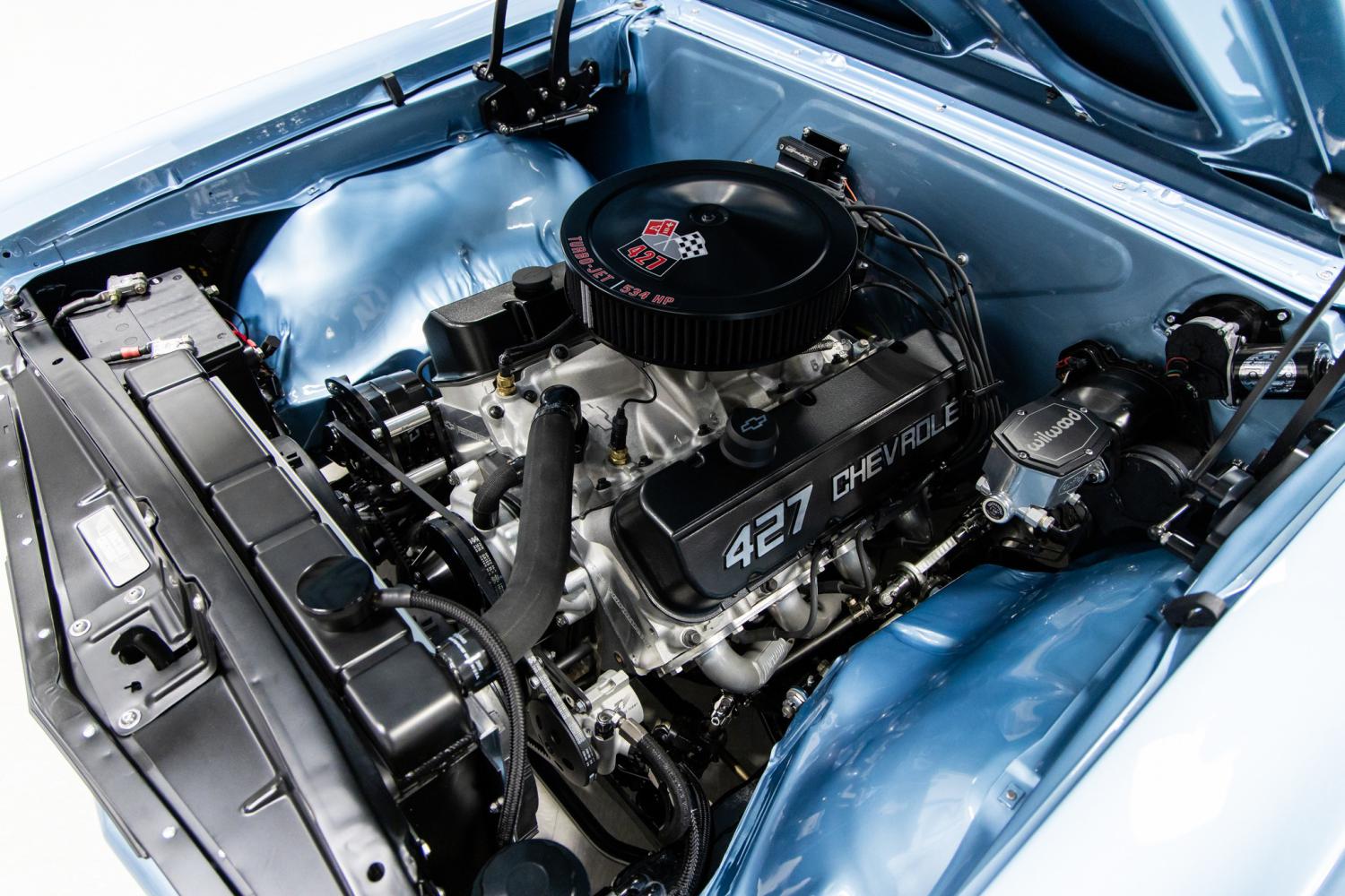 The engine compartment is highly detailed throughout with new parts. The backside of the hood was painted Nantucket Blue and it pivots on Eddie Motorsports black billet hinges. The smoothed firewall and inner fenders were also painted Nantucket Blue. The black radiator support was outfitted with a custom black show panel that proudly displays Back Bay Customs plaque. The car is powered by a new fuel-injected GM Performance ZZ427 crate engine that was dyno tested with 534 horsepower and 536 lb-ft of torque. The engine dyno sheets are included. The engine is fed through a Holley fuel injection system with a Terminator Stealth EFI carburetor, Sniper coil, Hyper Spark distributor and HP ECU. Some of the features include black Chevrolet 427 valve covers, black round air cleaner with 427 Cross flags and horse power decals. CVF black pulley system, black radiator thermostat housing, Lokar throttle cable, black billet dip stick, Chevrolet Performance wires, Milden Gold oil pan, Aeromotive fuel pressure regulator, Power Master 9500 starter, 140-amp GM 1-wire alternator and NAPA Legend battery. It's equipped with a New Port engineering wiper motor, Bosch electric power brake booster and Wilwood master cylinder. The engine is cooled by a Cold Case black aluminum radiator with dual electric fans, custom black cap and braided overfill line. The engine breathes through Flow Master ceramic long-tube headers and a 3” stainless dual exhaust system with Hooker mufflers. The engine is coupled to a TCI Street Fighter Turbo 400 automatic transmission with black finned pan. The power is transferred to an Action Machine custom driveshaft and Moser 12-bolt POSI rear end with 3.73 gears. It's equipped with power rack and pinion steering with a Turn 1 pump, Holley black billet reservoir and CPP u-joints.