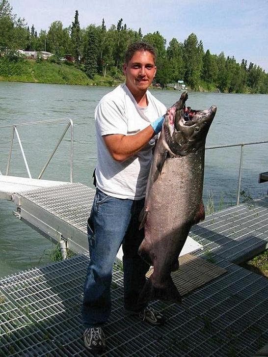 Hey folks, my family and I just got back this week from a 2 week mainland vacation , one of which was to Alaska do so some fishing. I did the fishing my wife did the catching. Her first time fishing and after only having her line n the water for 30 mins shes lands a 35 LB Kenai King Salmon.