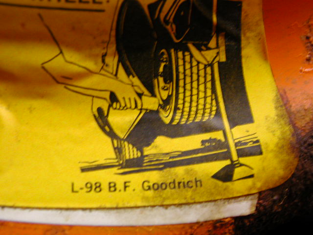 Has a B.F. Goodrich "Space Saver Spare" tire on it, size C 78-14. Looks like a BFG sticker was attached over another sticker at some point. I can't make out the letter code next to the valve stem (it wasn't stamped square). The back side of rim is black. I may "clean it up" if it is remotely correct for my 68. Any ideas as to the original application?? More pics to follow. thanks,