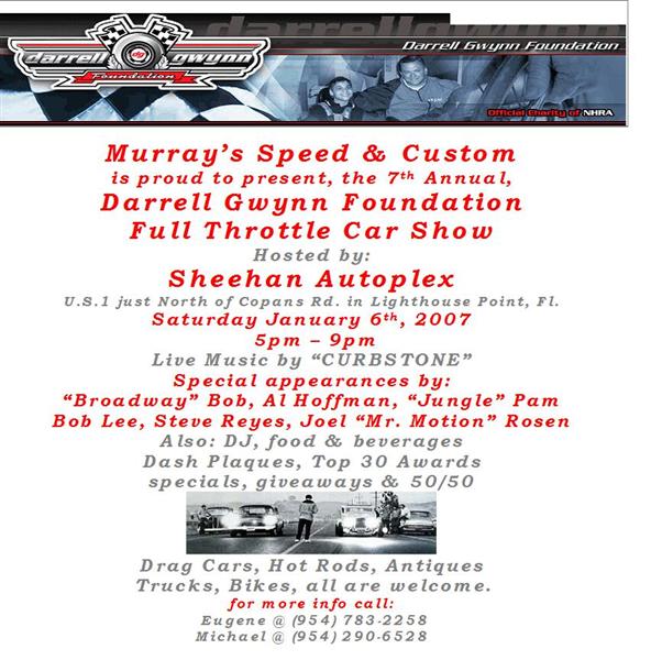 This is going to be a great show. We can't wait 'til Saturday. $15 registration - 50/50 raffle - Pictures & autographs All proceeds go to the Gwynn foundation; Darrell will be there approx. 7pm. Schedueled vehicles: Al Hoffman's Willys, Kevin Sine's 6 sec. FED & (hopefully) Vega Nostalgia Funnycar, Kevin Jones' 6 sec. '63 'Vette, Doug Horween's 6 sec. '68 Camaro & ElCamino, NHRA Hall of Famer Bob Lee & his 'Thunder Shifter', Lee Neal's Alky 66 Nova, Gene Goodyear's S/C Dragster, Russ Barfeild's beautiful S/C '57 Chevy & many more. </font> <font color="red"> DON'T MISS THIS ONE!!!! </font>
