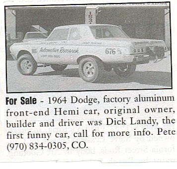 You caught me.. a guy from Ft. "DODGE" on a chebbie site. Rest assured I have no Dodges just Chebbies (and a few PLYMOUTH's ). Really wouldn't mind Landy's Dodge but I'd have to give away an "arm and a leg" and still couldn't afford it.The car was for sale in the late 70's in the National Dragster for considerably less(like all of them of course). If I can ever find the ad I'll post it. Having fun, Alex