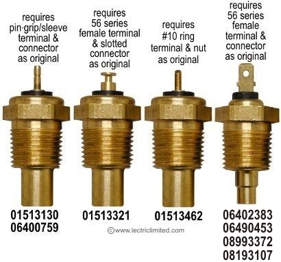 The info you posted is good, however those are all "Sending units" that send a variable resistance output ( a thermistor) to a gage. 1993369 is a temp switch only, it is either open or closed to ground the red idiot light. I checked with Lectric Limited and they do not make a temp switch. The photo I posted and the one Dan posted, I do still believe those are older after market switches made of steel and zinc plated. I am going to assume that a OEM switch would be brass like the senders are and would most likley look the same. Mike |