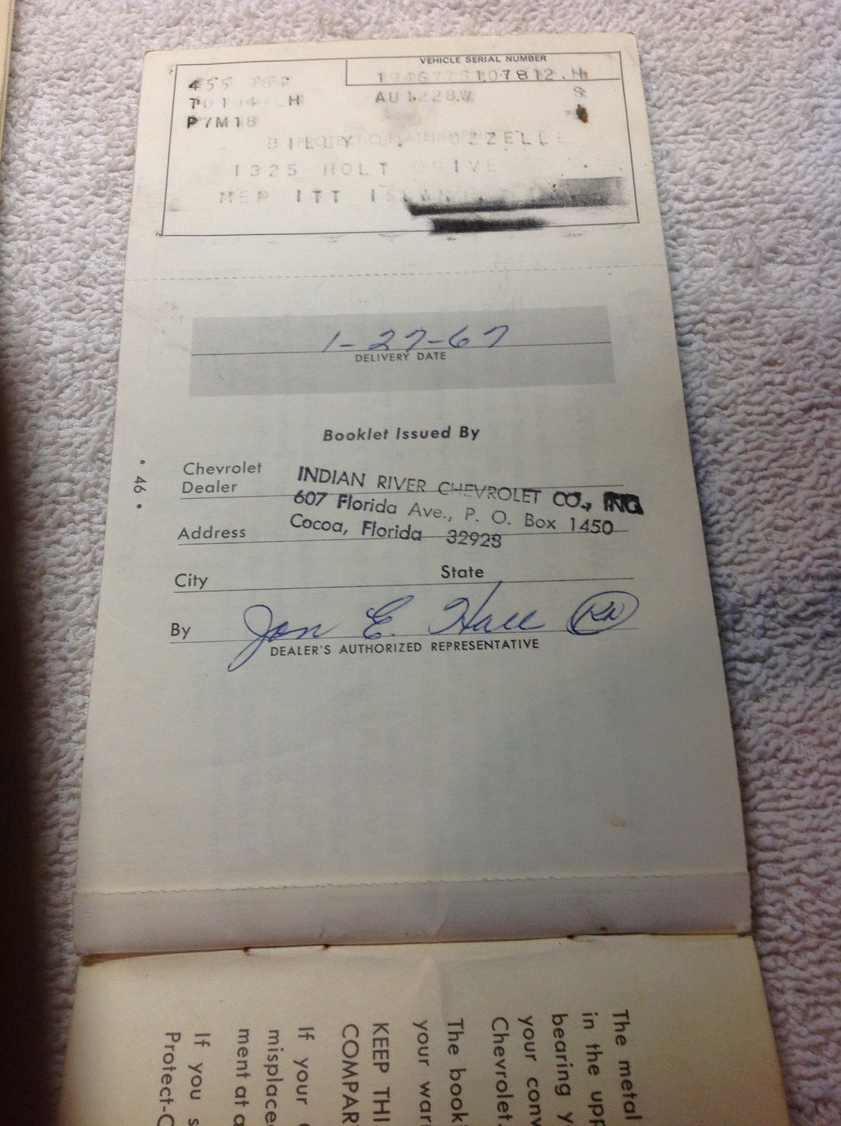 I just purchased a '67 Corvette that was delivered new to Indian River Chevrolet in Cocoa, FL. Does anyone have a Warranty Plate that I can compare the stamp from the dealer? Here's a copy of mine.