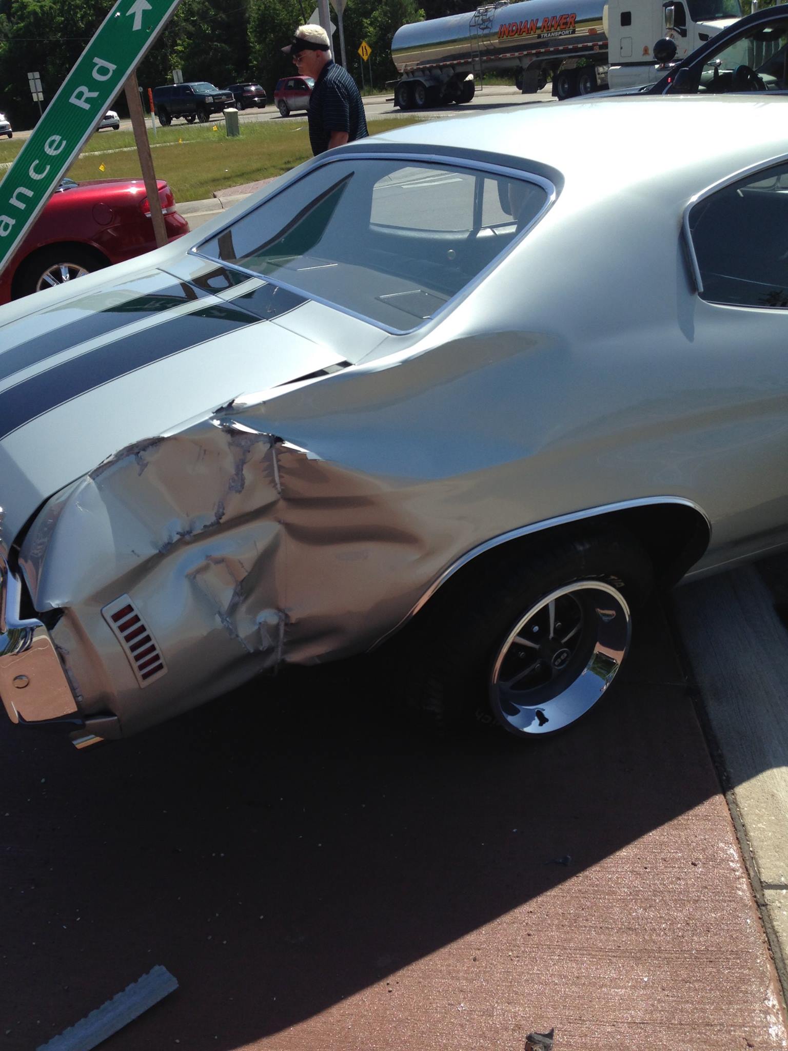 Wow,I talked to Steve the other day . He was looking for the hood spring numbers that I sold him awhile back that he misplaced. He also asked me if I knew anyone who had a set of quarters for his Chevelle. And I freaked out and said NO it didn't. He told me it was hit good. WOW!!Steve will have this car looking great again. What a great guy and an even greater car.