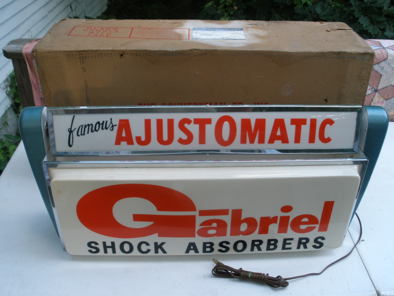 I have a 1963 NOS Gabriel Shocks sign, it rotates and lights up. with original carton, a must have for your Man cave, I just sold a crappy one for 800.00, this is near mint. Also to anyone interested I can send a video emailed or texted to show how it looks and functions. http://www.ebay.com/itm/1963-Gabriel...e=STRK:MESE:IT