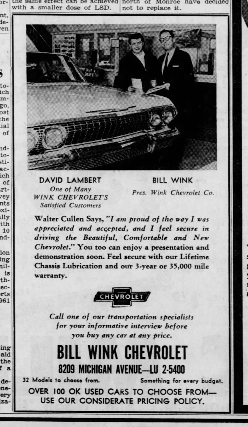 I am hoping someone can give me more information about Bill Wink Chevrolet in Detroit (?), Michigan. My Corvette Convertible came from there. Any memorabilia would be great. I have the original Michigan (1966) License plate so a license plate frame would be awesome. Thanks. -Dan