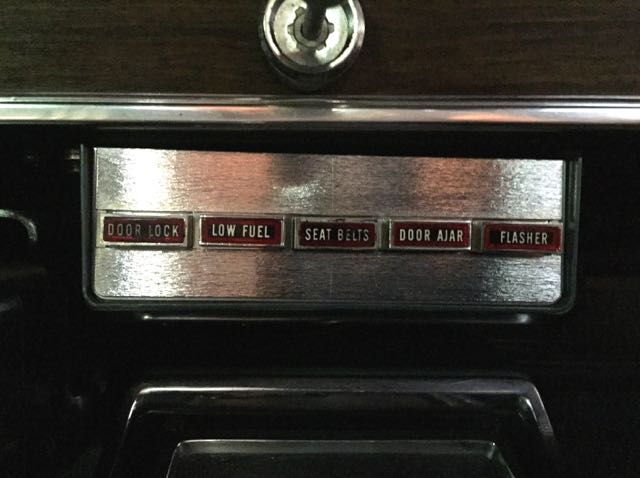 Well apparently its convenient to have all of these at your fingertips between the dash and console. 1,3, and 5 (door lock, seat belts, flasher) are buttons, 2 and 4 (low fuel and door ajar) are just lights. Not sure why seat belts is a button-maybe you can defeat buzzer if you prefer to be "thrown clear" to safety in this convertible. (I guess that's where the power brake money went-Power brakes were a $43 option while that convenience control panel was $51.50. I'd prefer the "convenience" of not using both feet to stop after banging through the gears....)