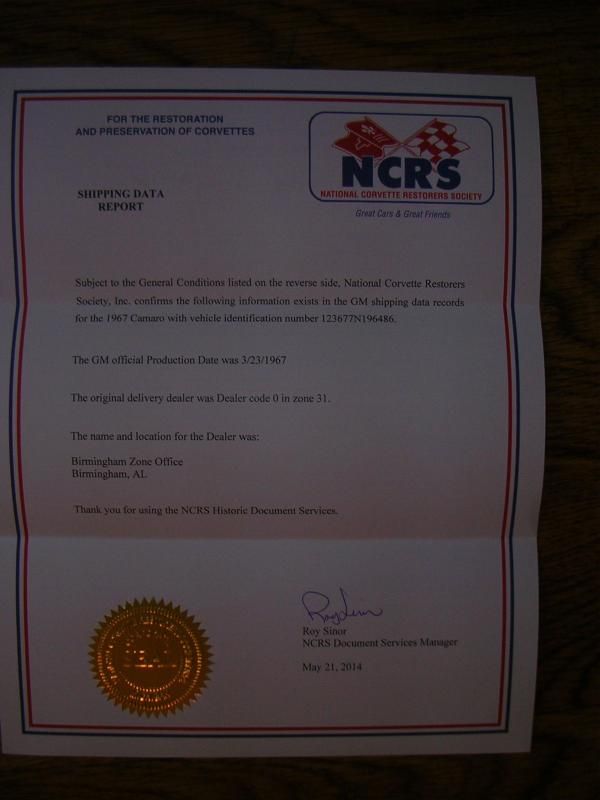 [QUOTE=danachevroletfor1967;1516749]That NCRS report is similar to what I received for my 1967 Camaro RS/SS. Mine lists the original delivery dealer as dealer code 0 in zone 28. /QUOTE]
