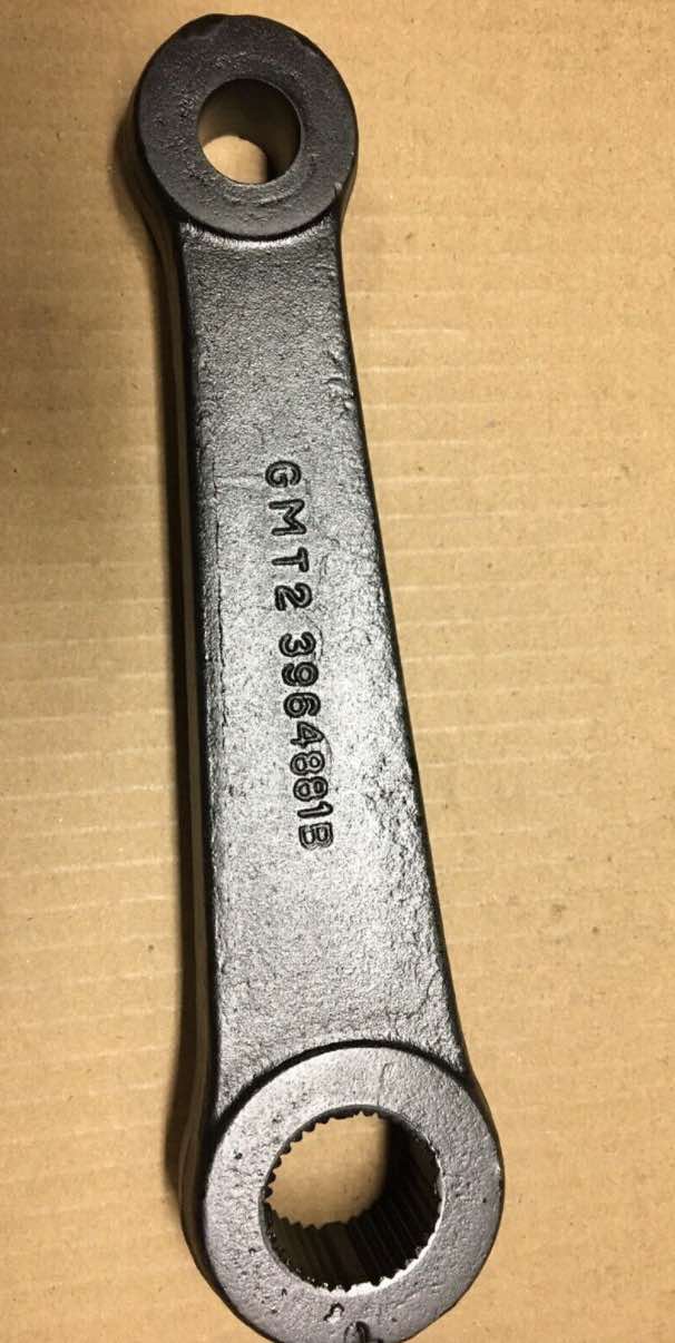 3964881 Pitman Arm Manual Steering. Identification stamped "M" on the splined end. Center to center ~6 15/16". Tappered splined hole, 1.033 small opening and 1.077 large opening. Typical for 1970 Camaro Z-28. PM me, Thanks.
