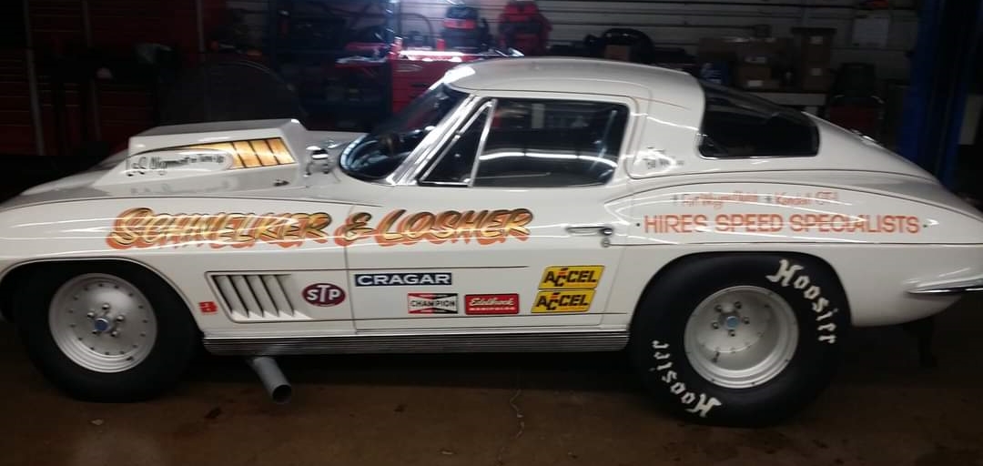 Original 1963 Corvette, modified to a resemble 1966/1967 to meet NHRA guidelines, most likely to run a BBC. Purchased by Schnelker and Losher from a friend, 1st ran a 250CI SBC with an Olds rearend, blew that engine at the 1971 US Nats at Indy. Had a racing buddy John Lingenfelter build them a 302CI SBC, redid the chassis, Dana rear, Doug Nash 5 speed, new tin work and hand lettered. Was very successful racing at several tracks around the Fort Wayne, IN area, as well as tracks in Michigan and Ohio, running numerous classes with NHRA, AHRA and IHRA. Car was parked in 1976 due to family commitments and the ever-rising costs of racing. Except for a couple of minor upgrades to be NHRA legal, car is as raced, and parked, in 1976. Plans are to run the car at a few nostalgia events.