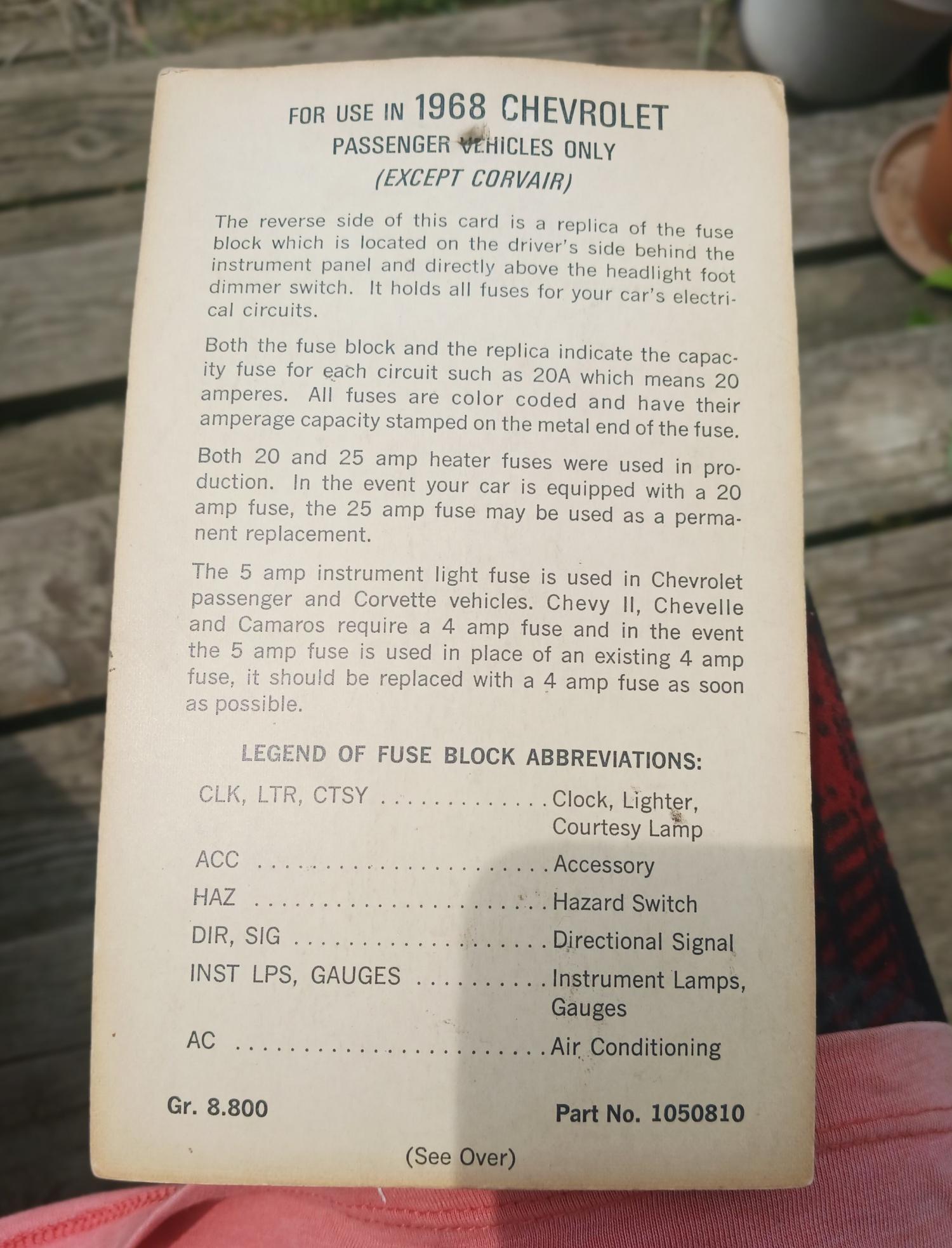 Next pics are a couple 1968 Chevrolet NOS fuse kits. Question is I have been digging into this and it seems 20 amp ones are plain. Found colors for other sizes not used in this car but 20's are always plain?? What say you? |