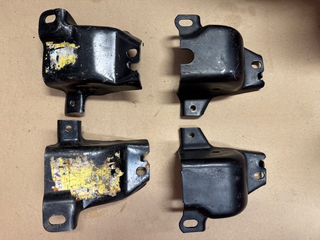 The GM Part Numbers are unreadable. The three bolts holes that line up with the J-Nuts in the frame rails are positioned the same as standard First Gen Camaro GM Leaf Spring Cups, Part Numbers 3892752 and 3892751. The major difference I can see is that the holes for the bolts that go through the front leaf spring bushings are set higher than the ones on the standard cups which would seem to give the car a higher stance? The standard cups are at the bottom of the photos. Any input on the application for these will be much appreciated. Thank you. |