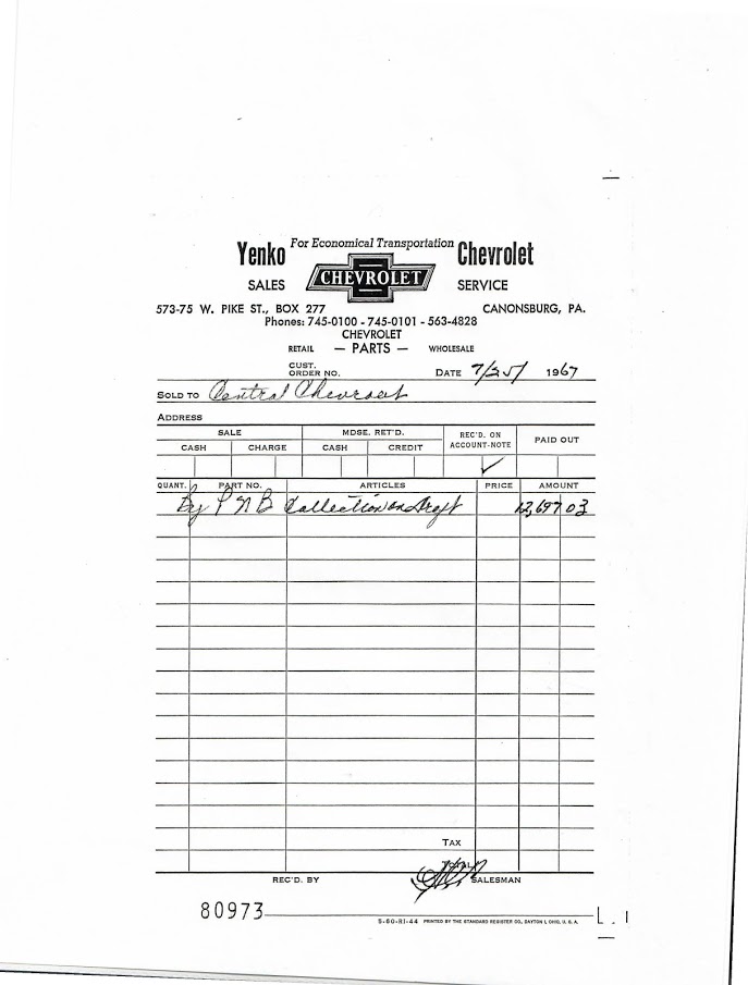 I have a '67 Corvette that came from Zone 13 Dealer 899 and records show this as Yenko Chevrolet in McMurray, PA. Has anyone heard of this dealership before (other than the one we are all familiar with)?