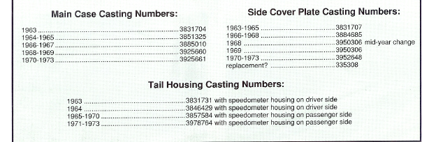 T-10 main cases cast: T10-1C are the first aluminum cases and used in '61 and '62. I'd be very interested in any that have VINs. The original trans from my car is still lurking out there somewhere..... It's hard to set a general value. Sometimes the cases are worth more than the guts. Verne |
