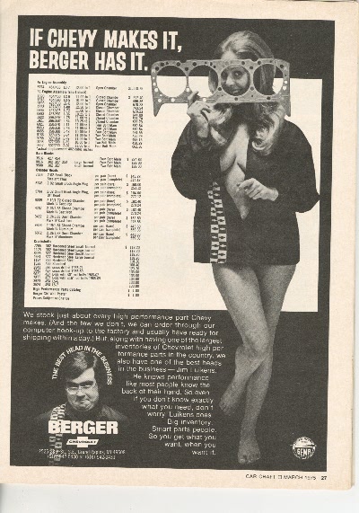 I was reading a March 75 issue of Car Craft and came across a cool Berger parts ad. Probably nothing new to all you gearheads, but it was a neat promo for their high performance parts program. Features a lovely lady and their parts guru Jim Luikens. "If Chevy makes it, Berger has it" is the headline. I will scan and post tomorrow if someone doesn't already have it. How about an LS-6 shortblock for $717.40...????