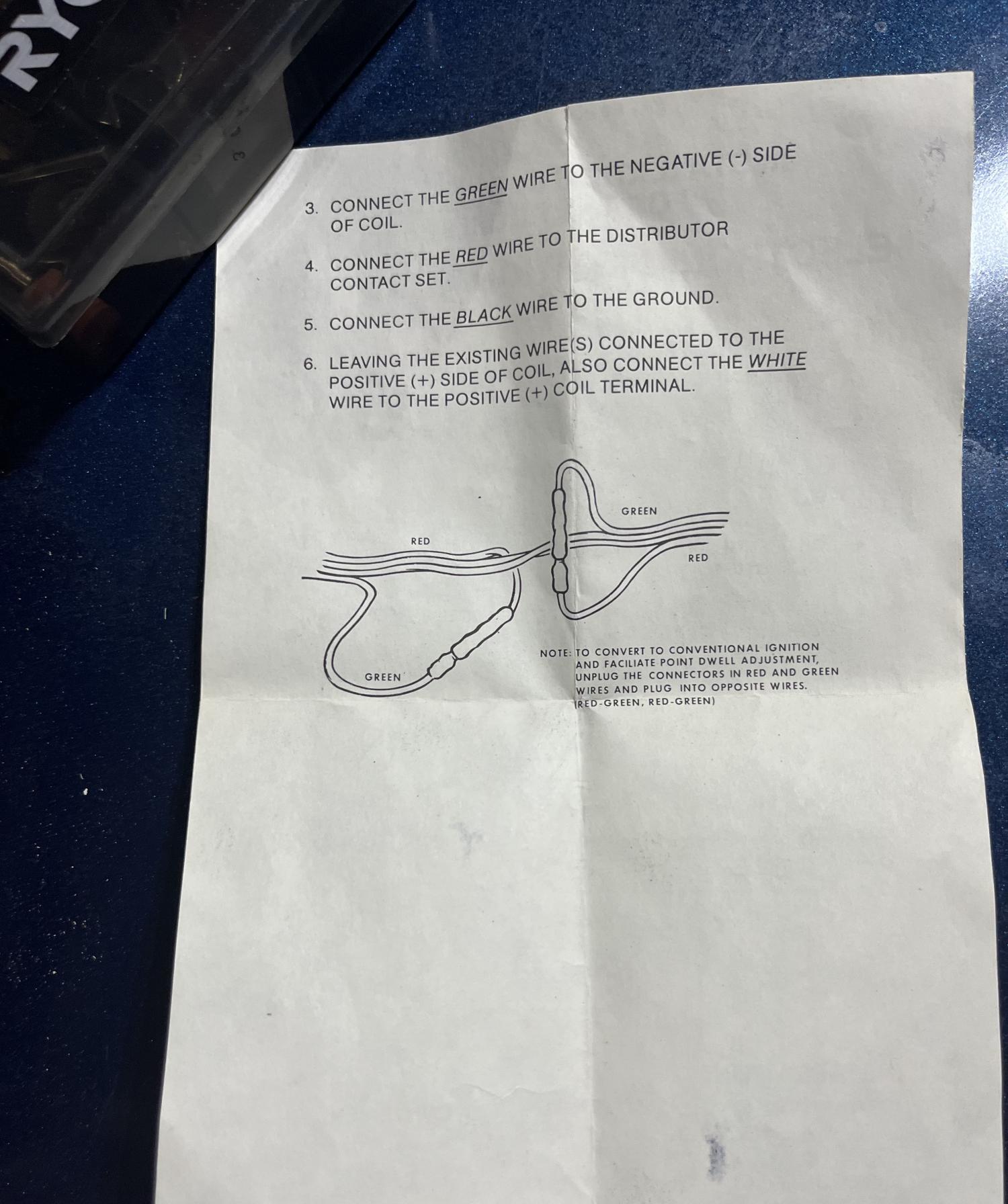 It has 4 wires: Red Green White with a red tracer Black Red and Green are connected together with a bullet style connector, and I’m assuming one goes to the positive and 1 to the negative side of the coil. But before I hook it up wrong and burn it up, does anyone have a set of old instructions for this so I can do it right? Thanks