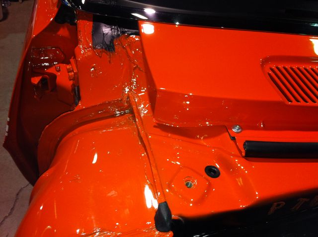 Over the last maybe two months a piece of it's history puzzle has been solved by of all things, a flat trailer tire on Brians rig near a small PA town. Turns out the guy that owned it and raced it back in the day is still around. He came to the Supercar Workshop last week to visit his old car and loan some old pics, racing jacket etc. Joe and Brian reproduced the lettering on the side on magnetic signage to show how it looked back in the day. Dick had bought the car used as a bank repo I think in 69. His friend worked at the bank and told him about it since he was a drag racer. Price the bank wanted was 1400.00. Dick only had 800.00. Bank guy and Dick end up rolling down the windows, flattening the tires, making the car look like crap, then taking pics and sending the pics to bank board. Dick gets the car for 800.00. The Yenko side stripes had already been removed but the edges were still in place in the door jamb area. In the pics Dick loans us you can see it still has the fender pinstripes and bowtie grill emblem. I think this is the only X11 style trim orange Yenko with no vinyl top. In the classic pic of the Yenko's sitting in the toxic lot you can clearly see a orange Yenko,no vinyl top with the fender pinstripes. We figure this is that car. Thanks guys. That was quite the surprise. And thanks Dick for the loan of pics etc. I'm glad you found your old car and got to see it. |