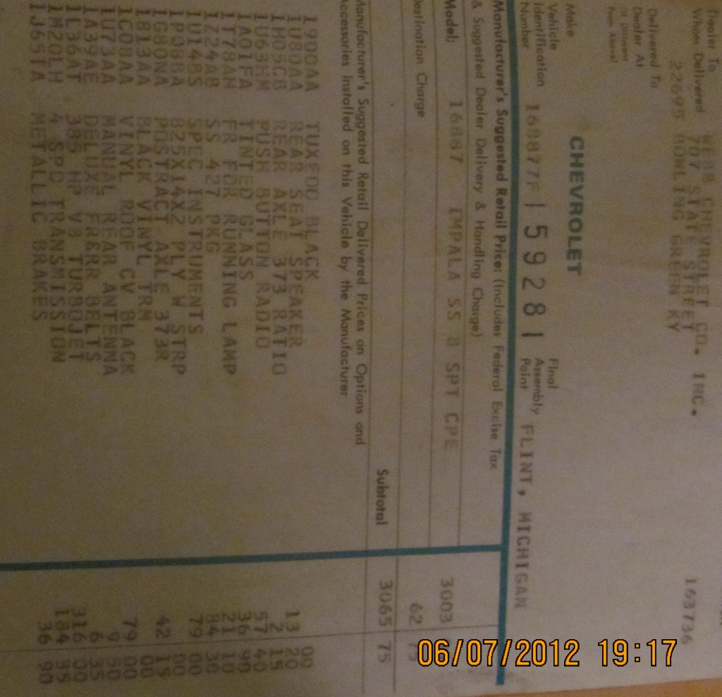 Have you checked for a broadcast card under the seats? Yours is the 75th 67 SS427 in the list. Warren