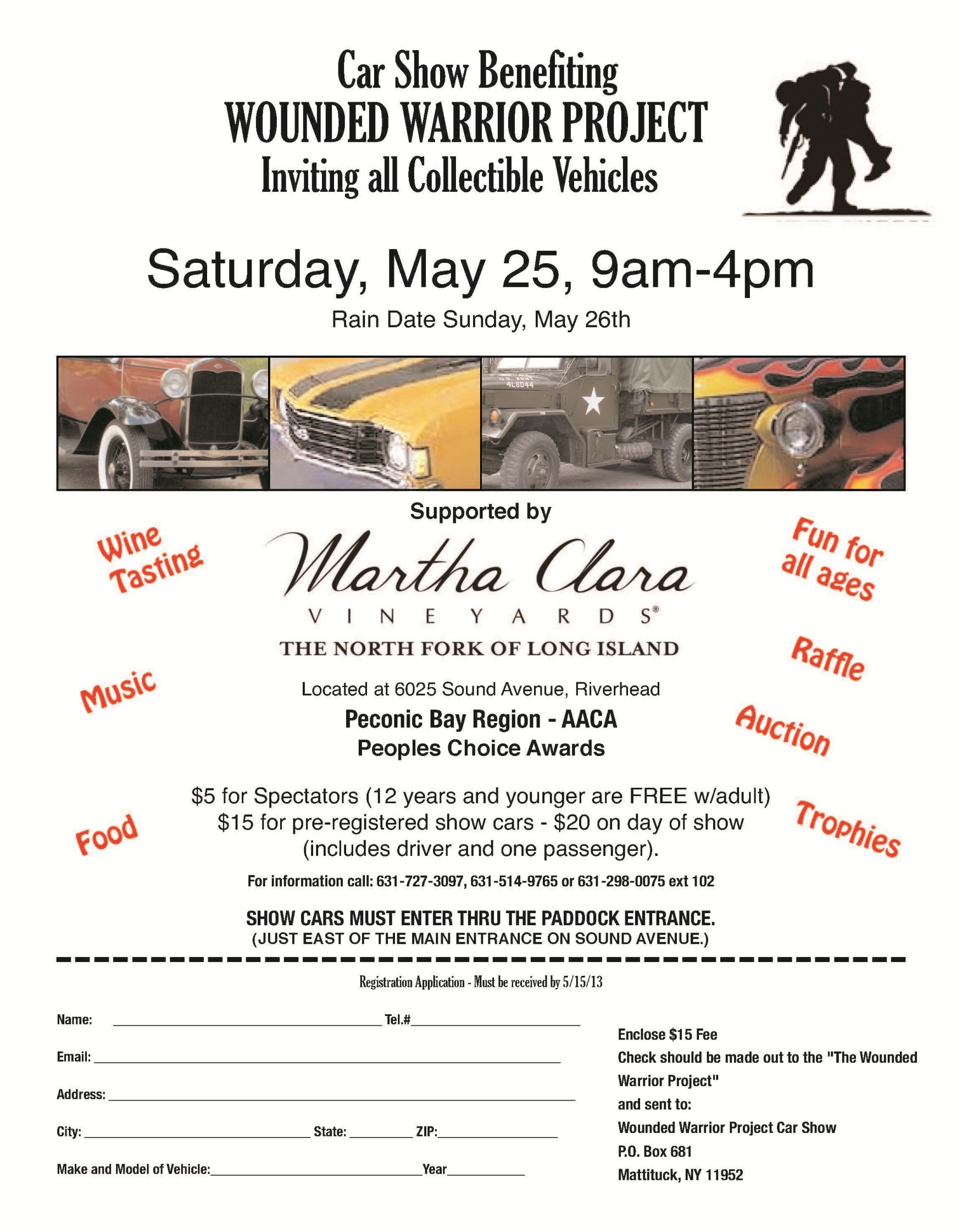 I am very excited about our annual Wounded Warriors Project Benefit Car Show. Martha Clara Vineyard has been generous enough to host this event again. This is an absolutely beautiful venue, located on the scenic north fork of Long Island. Participating in events such as this are both rewarding and inspiring. <span style="font-weight: bold">The show is rescheduled (Rain Date)for Sunday May 26th</span>, Memorial weekend. We look forward to a great turn out of both spectators, and participants. The vineyard offers, horse drawn wagon rides, farm animals, petting area, and of course plenty of food, wine and music.
