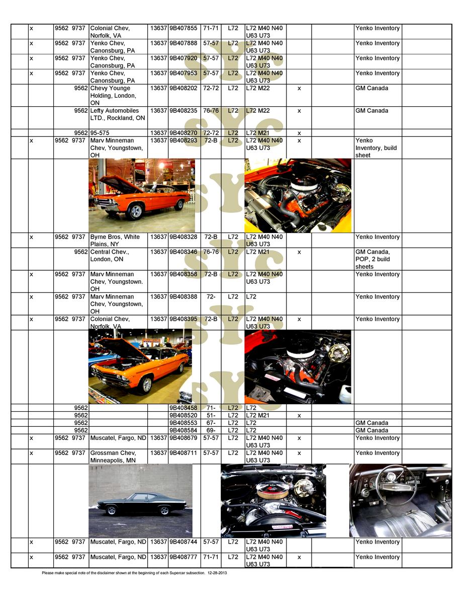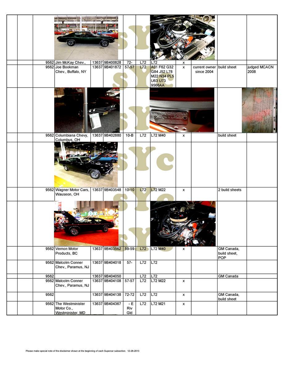 Chevelle sport coupe, four-speed manual, Positraction. Must be used with COPO 9694 disc brake option. 9562BA Chevelle sport coupe, TH400 automatic and Positraction. Must be used with COPO 9694 disc brake option. 9562CD Chevelle sport coupe, four-speed manual, Positraction, bucket seats, 15-inch tires, special coil springs. 9562CE Chevelle sport coupe, four-speed manual, Positraction, 15-inch tires, special coil springs. 9562DD Chevelle sport coupe, TH400 automatic, Positraction, bucket seats, 15-inch tires, special coil springs. 9562DE Chevelle sport coupe, TH400 automatic, Positraction, 15-inch tires, special coil springs. 9562EA Chevelle sport coupe, four-speed manual, Positraction, J52 power disc brakes, F70x14 tires. 9562FA Chevelle sport coupe, TH400 automatic, Positraction, J52 power disc brakes, F70x14 tires. 9694CA Four-speed manual, Positraction, special front disc brakes, J50 power brakes, COPO 9737 equipment. 9694CB As above, but with TH400 automatic. 9566AA Four-speed manual, Positraction, J52 power brakes, Super Sport wheels. 9566BA As above with TH400 automatic, 15-inch F70 raised white letter (RWL) tires on Rally wheels, Speedometer Reducer Gear. |
